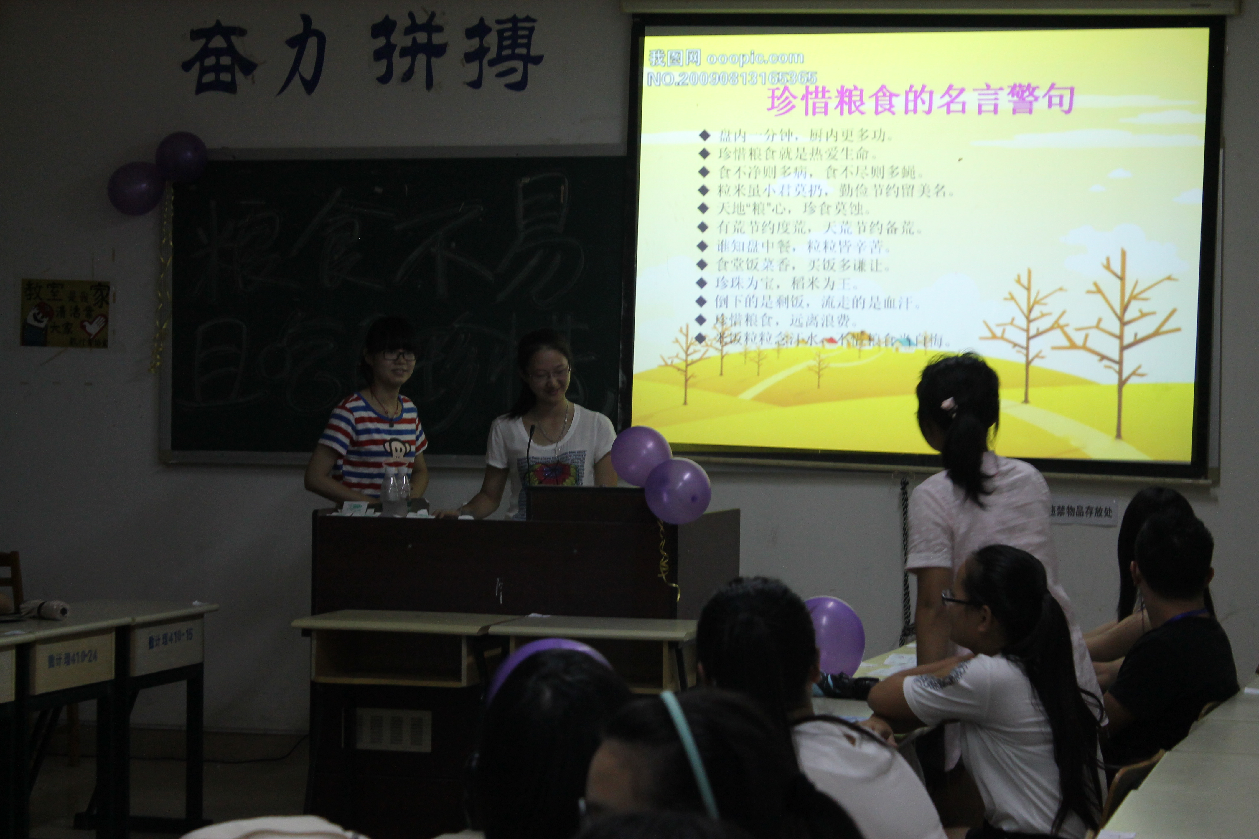 为办好此次的班团日活动,我院各班为此精心准备,活动形式新颖,主题深入人心,共同为建设文明、和谐、环保的校园作贡献。14数学别出心裁,由家喻户晓的《悯农》一诗引入,以图组“中国式剩宴”告诫大家切勿铺张浪费,并通过集体宣读“珍惜粮食,我必光盘”等口号加深同学们的光盘理念。13计算机(1)班播放了一支“光盘行动”公益广告也十分深入人心,引导同学们争做节约粮食的传播者、实践者和示范者。13数学则以凯文·卡特赢得九四年普立兹新闻特写摄影奖的作品《饥饿的苏丹》一图引出“且吃且珍惜”这一主题,向大家展现了节约粮食的重要性。