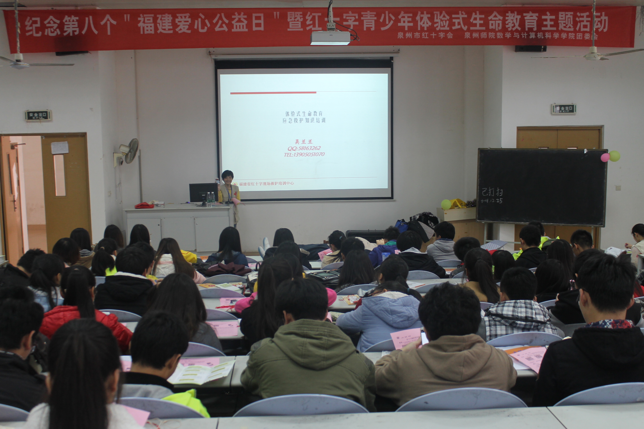 12月25日下午3时,泉州红十字会与英国威廉希尔公司官网数学与计算机科学学院为纪念第八个“福建爱心公益日”,在理工419开展了“红十字青少年体验式生命教育”主题活动,对同学们进行体验式生命教育与现场急救知识专题培训。