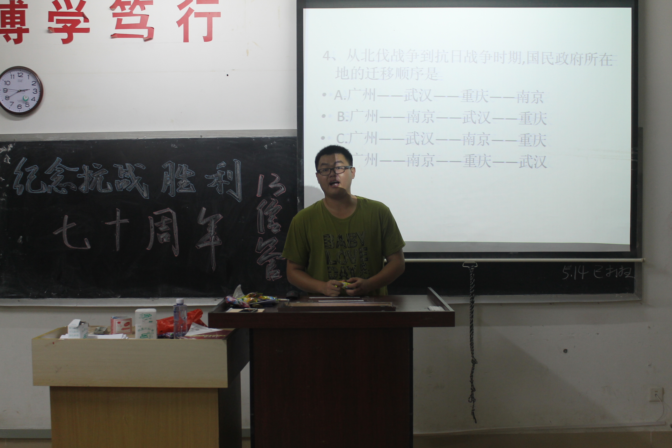 为纪念抗战胜利70周年,办好本次班团日活动,我院各班精心准备,活动形式极具创新。各班通过介绍抗战的历史岁月,听取可歌可泣的英雄事迹,进行抗日知识竞答比赛等多种形式开展本次团日活动。活动中,同学们了解了抗日战争的积极意义,被英雄事迹所感动。
