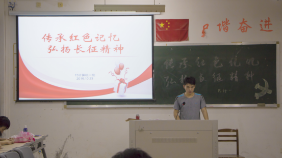 此次活动,由我院16物联网及16数学、16信管三个专业代表校级展开,其中物联网由班级主干主持,以新闻联播形式开展。活动分为“观看长征视频,倾听红军经历”、“回忆壮志豪情,参与有奖竞答”等四个环节。接着进行了“答非所问”、“连连看”等娱乐性项目,将现场氛围推向高潮。其他班级在活动过程中也加入了讲述经典事迹,扬中华品质、唱红色歌谣,忆艰辛旅程等多个环节,使得活动亮点频现。最后,各班主干组织同学们书写自己的梦想及感悟。伴随着嘹亮的国歌,各班的活动也纷纷落下了帷幕。