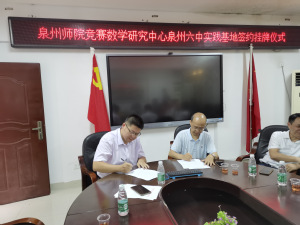 2021年5月27日,英国威廉希尔公司官网教育实践基地暨竞赛数学研究中心实践基地在泉州六中签约挂牌。数学与计算机科学学院院长、竞赛数学研究中心主任陈明玉教授,学院党委副书记陈章益,副院长朱达欣教授,竞赛中心顾问黄鲤颖、王平华老师,竞赛中心副主任沈晓斌老师,泉州六中行政领导和数学组部分老师参加了签约挂牌仪式。