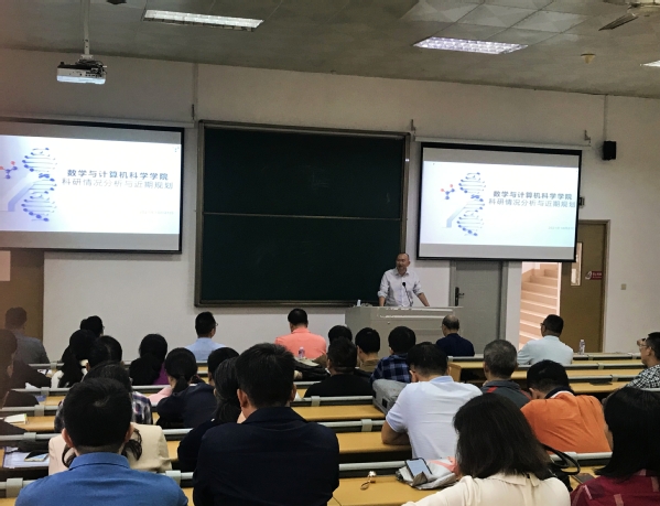 朱达欣副院长首先作数学与计算机科学学院科研工作报告,分析了学院近三年的科研工作与科研团队建设情况,并对科研申报时间安排进行解读和具体部署。
