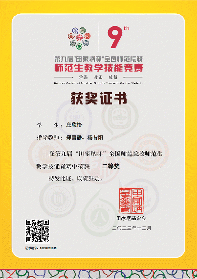 2023年12月29日至31日,“田家炳杯”第九届全国师范院校师范生教学技能竞赛决赛在浙江师范大学落下帷幕。我院数学与应用数学专业2021级庄欣怡同学在郑雪静和杨昔阳老师的指导下喜获二等奖,这是继上一届竞赛2020级张海丽同学荣获二等奖后再次取得的佳绩。