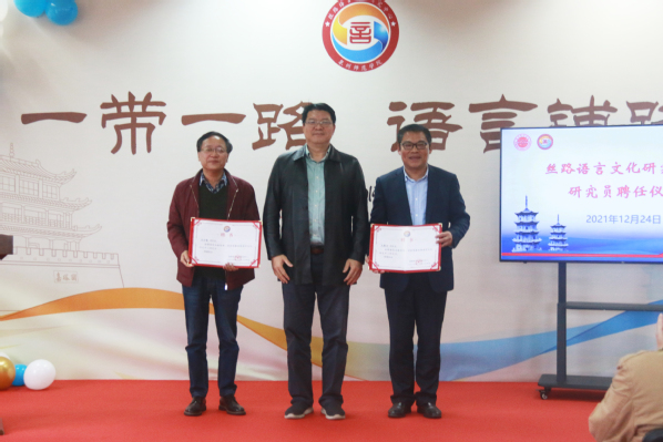聘书颁发仪式上,夏侯建兵为丝路语言文化研究中心主任王勇卫及副主任王万盈颁发聘书。随后,夏侯建兵及研究中心主任为中心聘任的26位研究员颁发聘书。