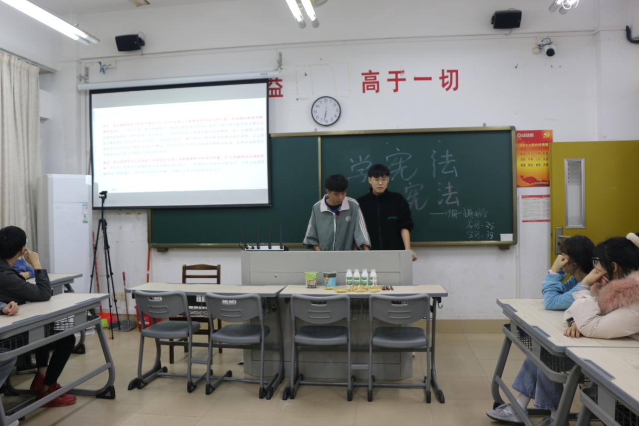 2019级国际经济与贸易一班为同学们普及了宪法日的来历,说明了设立宪法日的意义,还以现实中的典型案例告诫同学们要遵守法律,遇事用法律来保护自己。2019级国际商务专业同学则通过朗诵《法治诗歌》加深同学们对习近平法治思想的理解。
