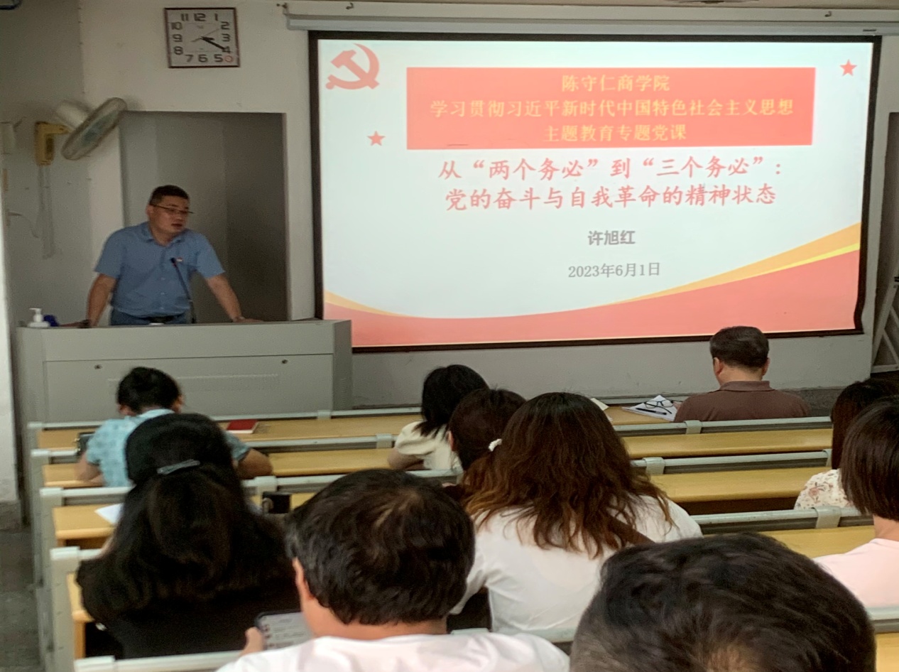 6月1日下午,陈守仁商学院党委副书记、常务副院长许旭红为全体教职工上题为《从“两个务必”到“三个务必”:党的奋斗与自我革命的精神状态》专题党课。