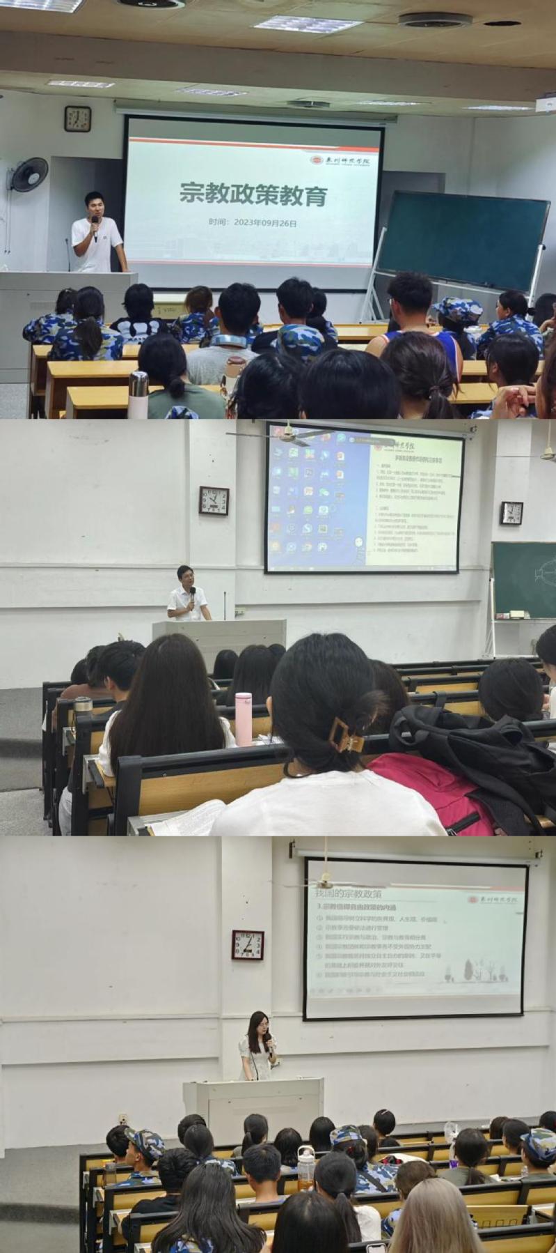 9月26日,陈守仁商学院组织开展宗教政策教育。新生辅导员与自律会宣讲团成员阐述了宗教的本质、产生和存在的根源,以及我国宗教的基本特点,强调了党的宗教工作基本方针,坚持教育与宗教相分离原则,要求同学们正确认识和对待宗教问题,自觉抵御西方敌对势力利用宗教对高校进行的渗透,树立正确的世界观、人生观和价值观,不断提高思想道德素质和科学文化素质,坚定共产主义信仰,努力成为德智体美劳全面发展的社会主义建设者和接班人。
