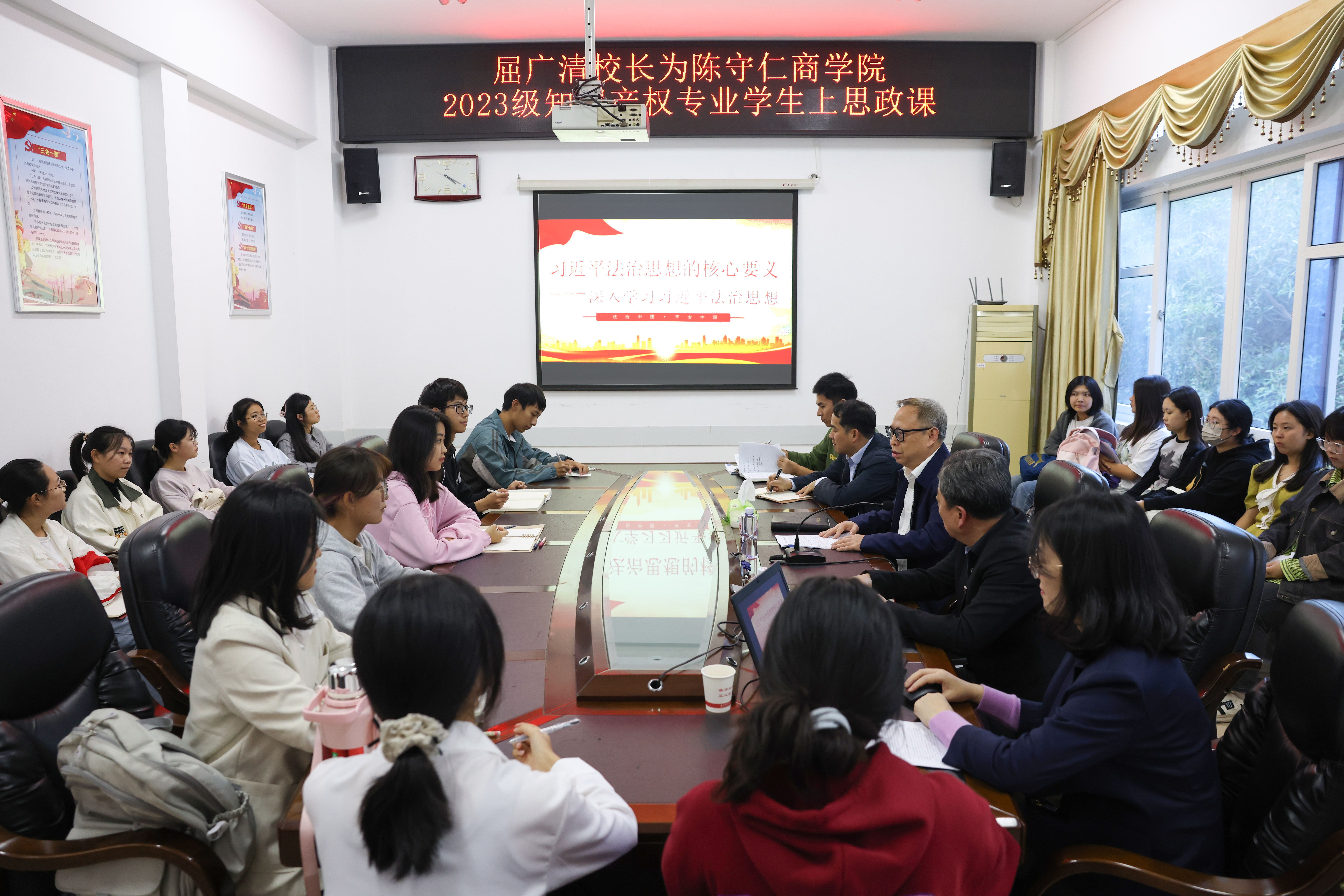 11月27日下午,校长屈广清为陈守仁商学院2023级知识产权专业学生上题为《习近平法治思想的核心要义---深入学习习近平法治思想》思政课。陈守仁商学院党政领导和辅导员参加。