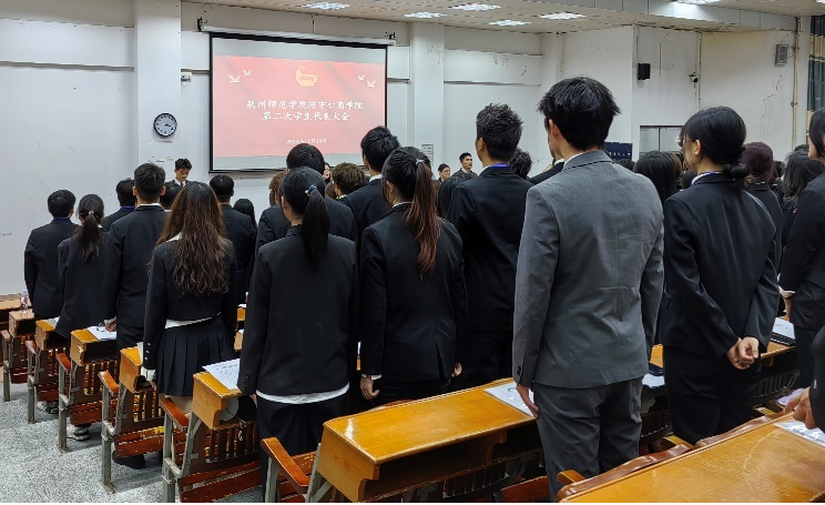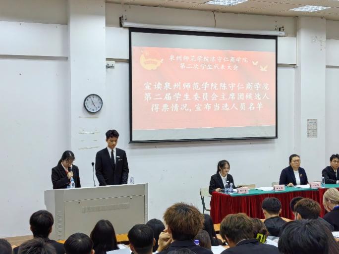 日前,陈守仁商学院于文科A楼214室召开第二次学生代表大会。学院学工办副主任吕赫阳及全体辅导员出席会议,校学生会主席团代表受邀参加会议。