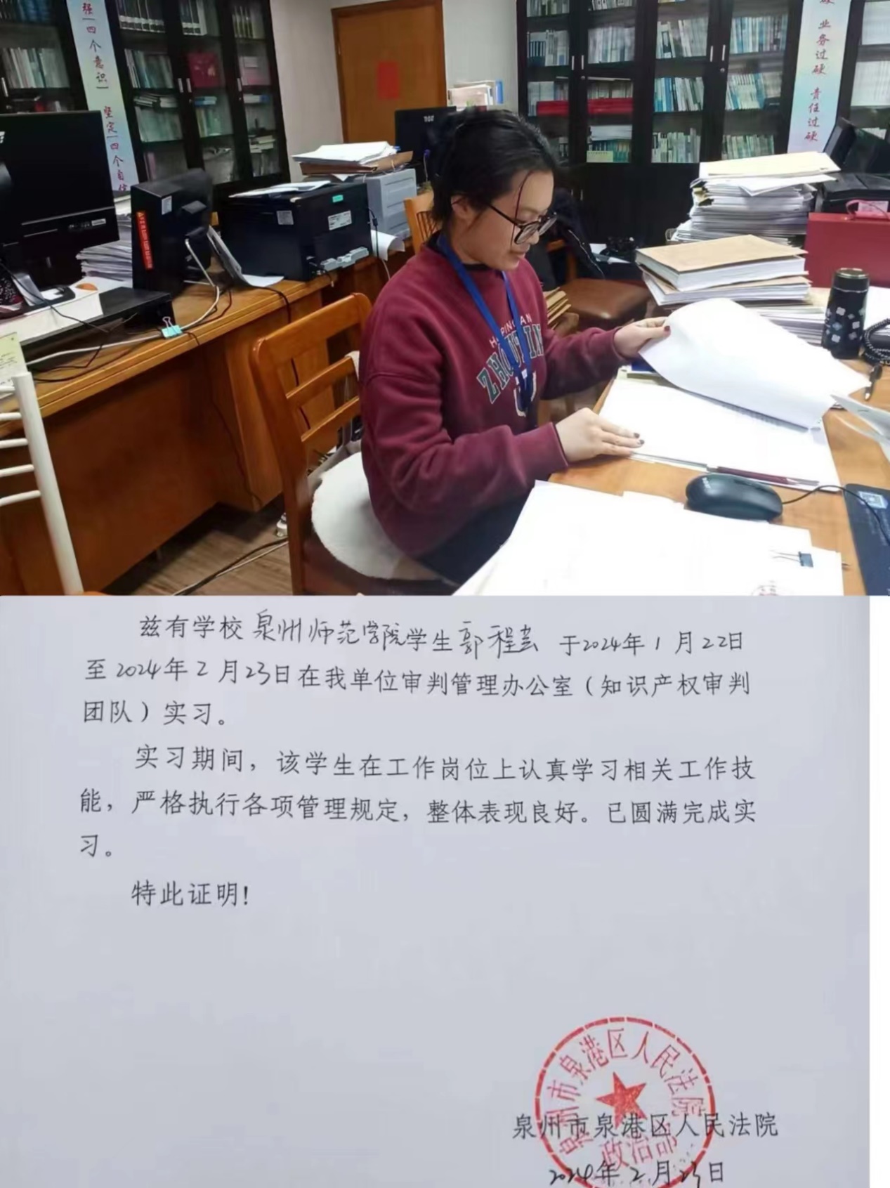苏蕙娟,陈守仁商学院2023级知识产权专业学生。她参加福建省大学生实习“扬帆计划”活动,担任福建省安溪县人民法院实习生。在实习过程中,主要工作是整理卷宗以及查找一些判决书、裁决书。在此次工作中,她认真学习法律知识,虚心向各类人员请教法律问题,提高了自己的见识和技能。
