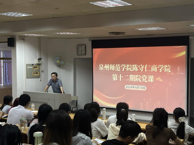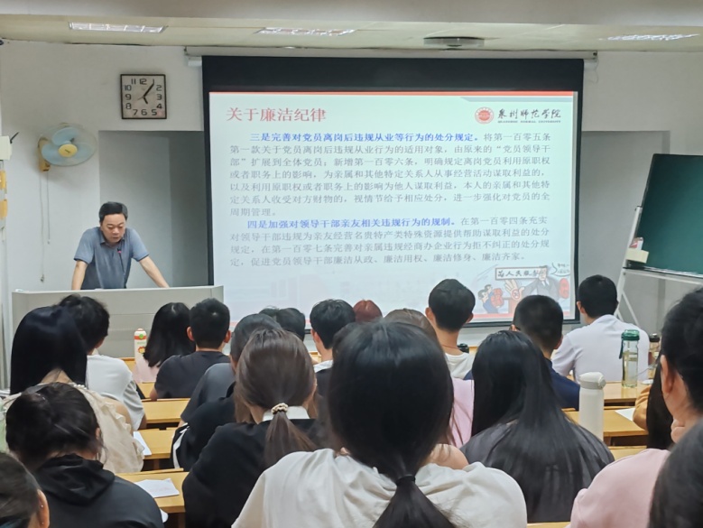4月18日下午,陈守仁商学院于文科楼b栋413教室举办第十二期院党课,就新修订的《中国共产党纪律处分条例》(以下简称《条例》)进行专题辅导,本次课程主讲人为学院党委书记胡凌松,入党积极分子和“青马班”学员参加。