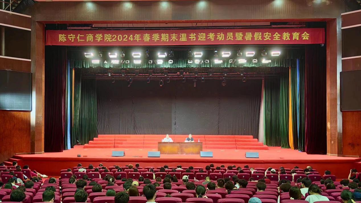 随着期末来临,为强化学生考纪意识,营造良好期末复习氛围,切实加强学院学风建设,做好学生暑假安全教育管理工作,陈守仁商学院于2024年6月20日下午在陈祖昌礼堂召开期末温书迎考动员暨暑假安全教育会。学院常务副院长许旭红、党委副书记曾文超出席会议,结合温书迎考和安全稳定工作上思政课。全体非毕业班同学参加会议。