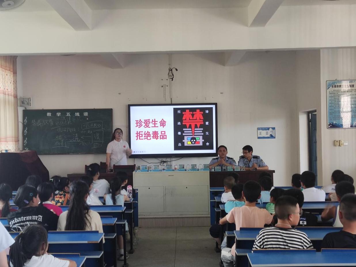 为了进一步加深青少年对毒品危害的认识,提高未成年人自我保护意识,促进其健康快乐地成长,7月5日下午,涌泉支教普法队联合洋墩乡派出所为洋墩中心小学学生开展禁毒宣传教育。