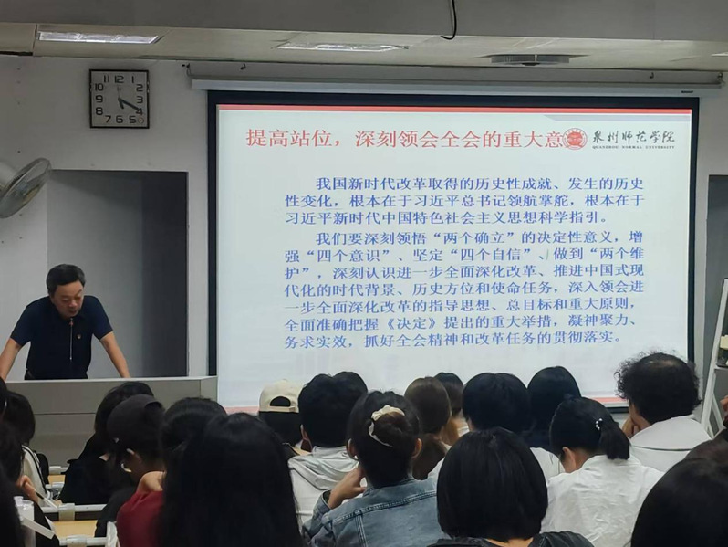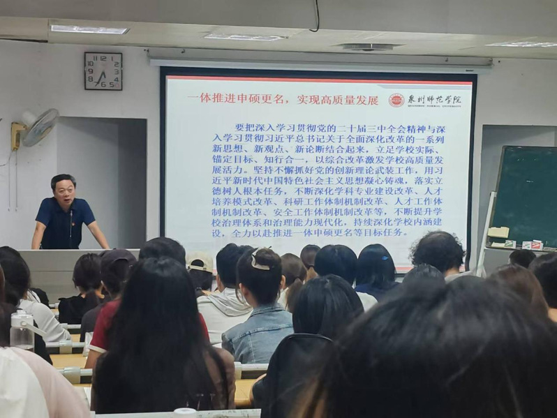 胡凌松就《中共中央关于进一步全面深化改革、推进中国式现代化的决定》的主要内容,进一步全面深化改革的“七大聚焦”、“六大原则”,深刻领会全会的重大意义等方面开展解读,指出要准确把握教育改革发展方向,深化教育综合改革、深化科技体制改革、深化人才发展体制机制改革,坚持以立德树人为根本任务,推动教育改革创新,完善立德树人机制。