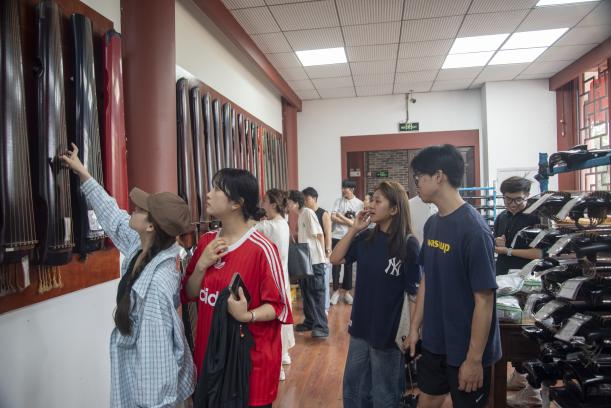 在龙琴坊古琴制作工坊,学生们实地观摩选材、定型、槽腹、髹漆、安足、上弦等完整制作工序。据介绍,每一床龙琴需历经七年雕琢、百余道工序方可成型,匠人们对工艺的极致追求与文化传承的使命感,让在场学生深切体会到传统手工艺的温度与深度。