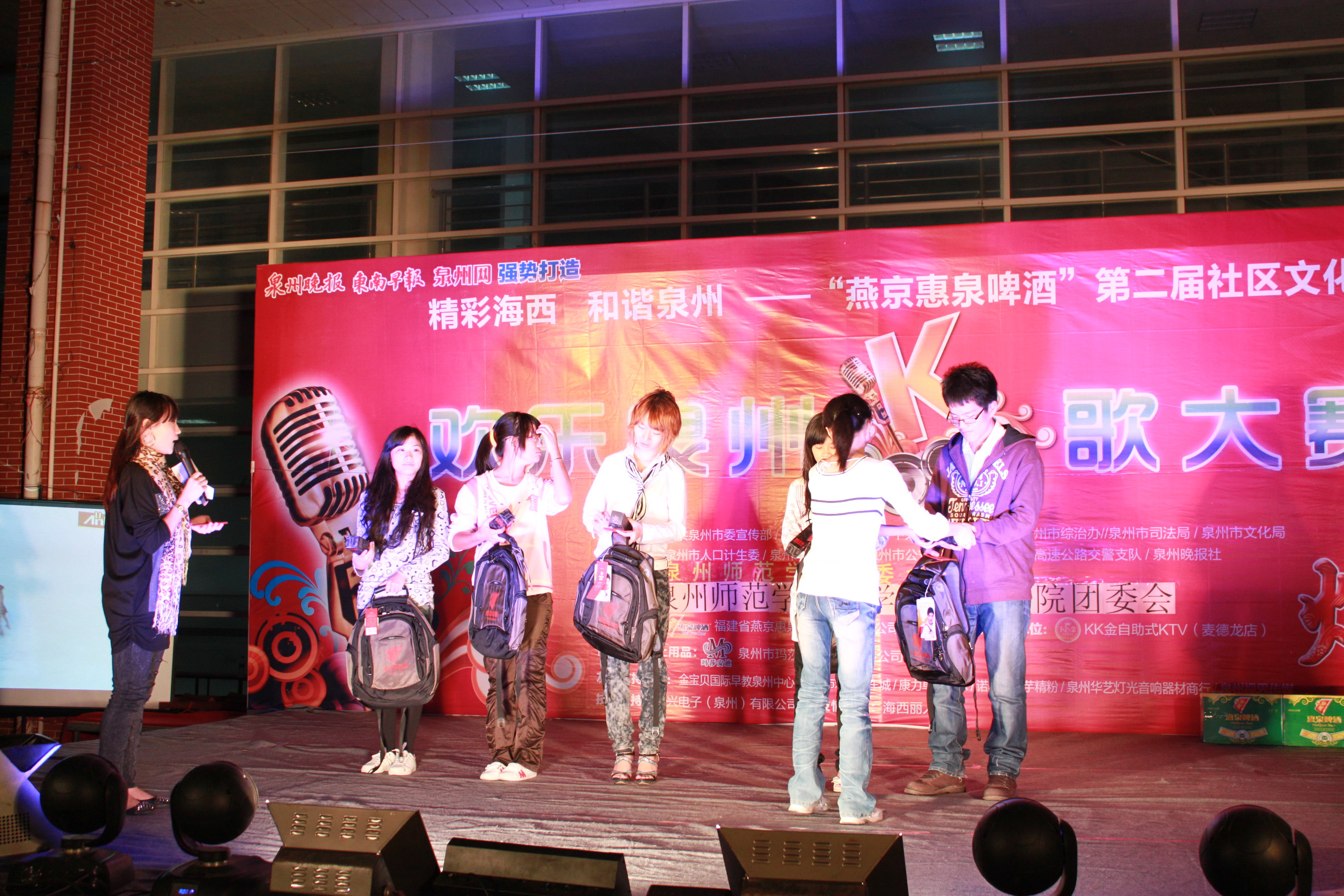 知识竞答比赛结束后,“惠泉啤酒第二届社区文化节欢乐泉州K歌大赛”海选在我校中山广场随即举行。此次海选引来25名歌唱好手同台竞技,近百位观众前来观看。比赛采用电脑系统自动评分,对演唱的音量、音色、音调的平衡性要求较高。比赛场面盛大,气氛热烈。我院郎斌、江雯燕、王文豪等同学参加比赛并获得佳绩。