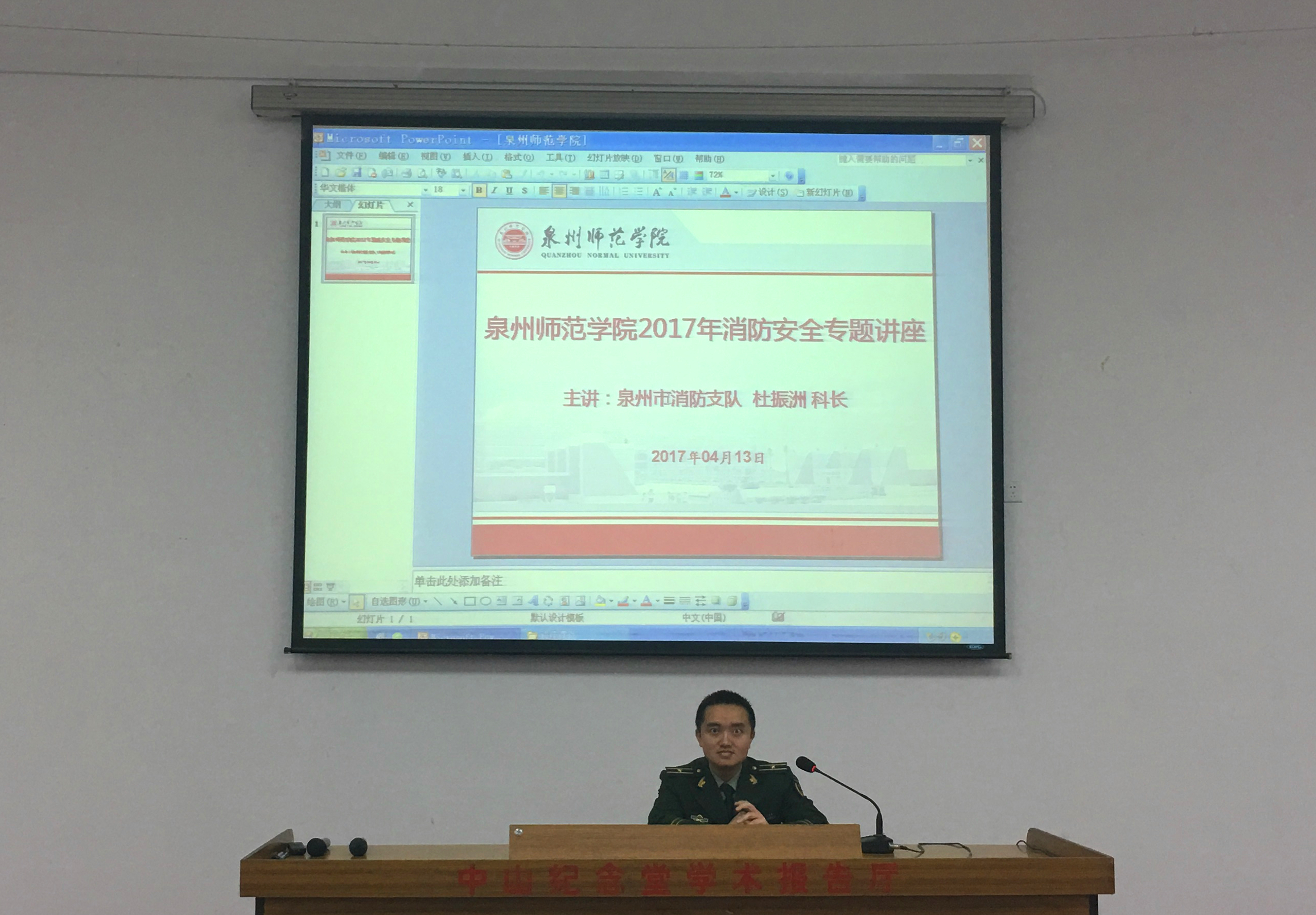 4月13日下午,泉州市消防支队杜振洲科长受邀于中山第一学术报告厅开展了一场关于消防安全知识的专题讲座。我校全体食堂员工、学生校卫队员以及文传学院、工商学院各专业学生代表参加了此次讲座。