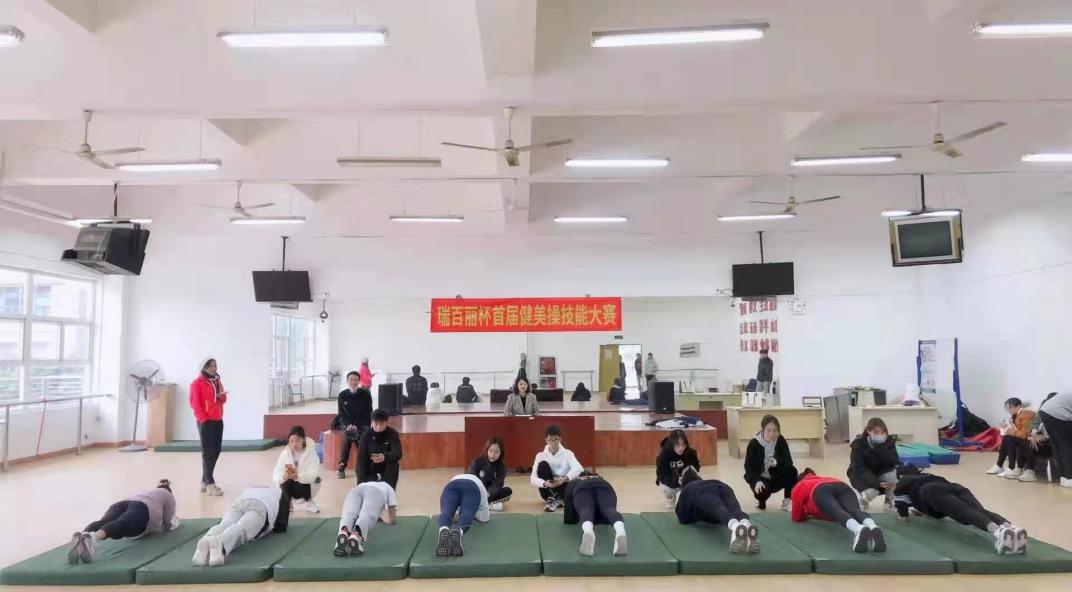 随后举行的健美操技能赛也在12月17日进行,本次健美操赛得到校企合作单位瑞百丽健身学校在赛事编排、赛事赞助、赛事组织等方面的大力支持,本次大赛共有五个项目,分别是第三套大众健美操锻炼标准—三级操、自选曲目、趣味俯卧撑、平板支撑和波比跳。经过将近一个月的时间准备,同学们将自己的努力成果展现了出来。最终,来自17社体的杨惠、王映玥、沈宏伟三位同学分获总分第一、二、三名。