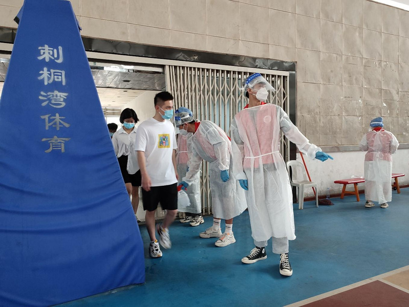 检测开始前,志愿者们迅速换上白色防护服做好准备工作,引导组织好新生队伍有序地在各个核酸检测点排队等候。