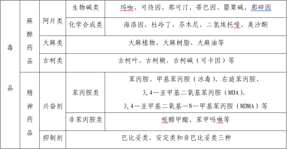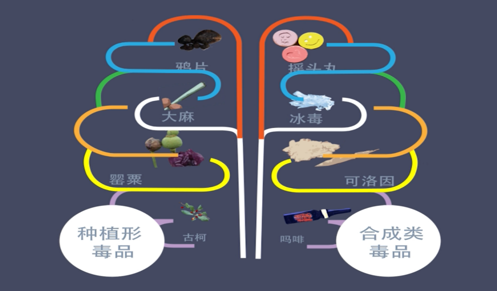 《麻醉药品及精神药品品种目录》中列明了121种麻醉药品和130种精神药品。根据中国禁毒网权威发布, 毒品分为传统毒品、 合成毒品、 新精神活性物质(新型毒品)。其中最常见的主要是麻醉药品类中的大麻类、鸦片类和可卡因类。