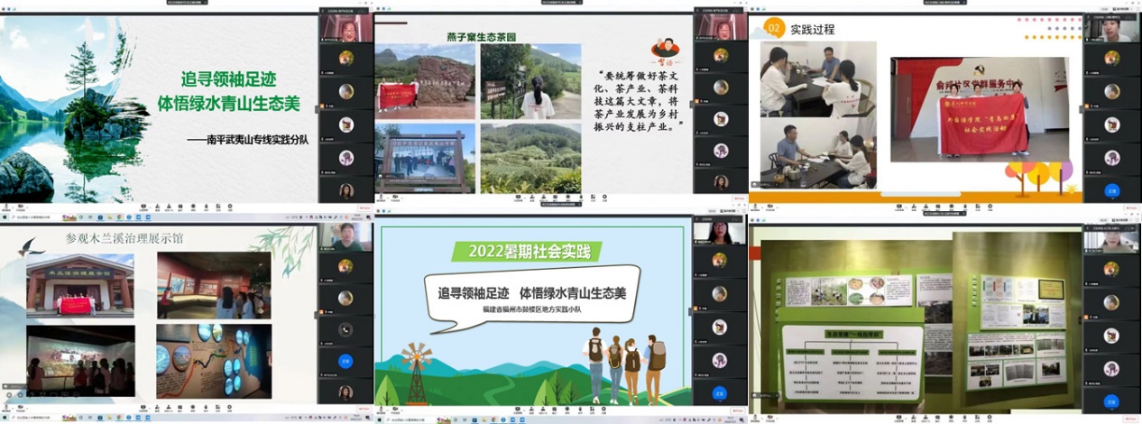 实地走访后,5支社会实践队的队员们在线上举行“追寻领袖足迹,体悟绿水青山生态美”社会实践活动线上总结会。同学们结合实地走访的情况,分享了社会实践活动过程中的照片、经历与故事等,畅谈对习近平生态文明思想在地方生动实践的感悟。这次以生态文明建设为主题的社会实践,为队员们上了一堂深刻形象的习近平生态文明思想理论学习和实践课程。大家纷纷表示,要进一步牢记习近平总书记嘱托,积极投身福建生态省和国家生态文明试验区建设中,争做习近平生态文明思想的坚定信仰者、忠实践行者和不懈奋斗者,以实际行动迎接党的二十大胜利召开。