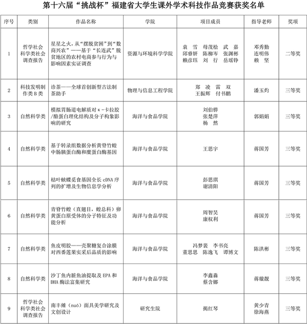 据悉,“挑战杯”福建省大学生课外学术科技作品竞赛是我省大学生科技创新活动的重要内容,竞赛每两年举办一届,从1992年开展至今已是第十六届,是我省大学生课外学术科技活动中一项具有导向性、示范性和群众性的竞赛活动。本届大赛由团省委、省科协、省教育厅、省社科院、省学联联合主办,福建农林大学、共青团福州市委共同承办,共评出特等奖25件、一等奖50件、二等奖123件、三等奖302件。