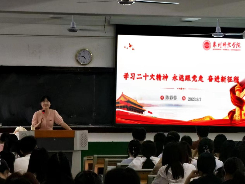 9月7日,我院团干老师过祥、陈彩蓉在南安学院高盖教学楼给2022级学生开展《“学习二十大,永远跟党走,奋进新征程”》的主题教育团课。主题教育团课深入学习宣传贯彻党的二十大精神,教育引导广大青年深刻领悟“两个确立”的决定性意义,铸牢听党话、跟党走的思想根基,用青言青语讲好开学“第一课”。