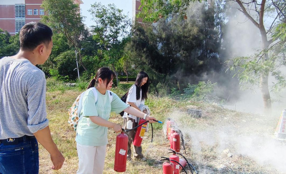演练过程中,校保卫处洪国祥老师详细地介绍了灭火器的相关知识,同时也为在场学生示范如何正确使用灭火器。随后,同学们在辅导员李祖阳老师的指导下亲身实践灭火。