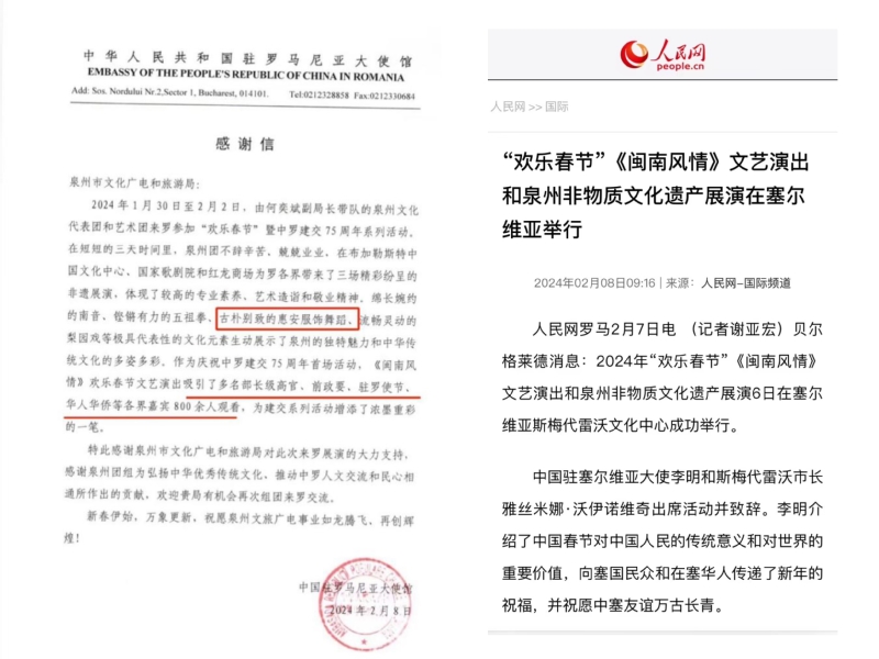非遗承载着中华文化,春节寄托着美好希望。在春节期间,实践队前往“一带一路”沿线国家推介泉州非遗,受到各国音乐艺术家以及当地观众热捧。庆祝中罗建交75周年《闽南风情》欢乐春节文艺演出结束后,韩春霖大使亲切地问候演出人员并送上祝福,我院学子仔细聆听,备受鼓舞。人民网、欧洲时报、CIUB布大孔院海丝泉州文旅之声等众多媒体或通过纸媒报道,或通过视频号、公众号再现演出盛况。