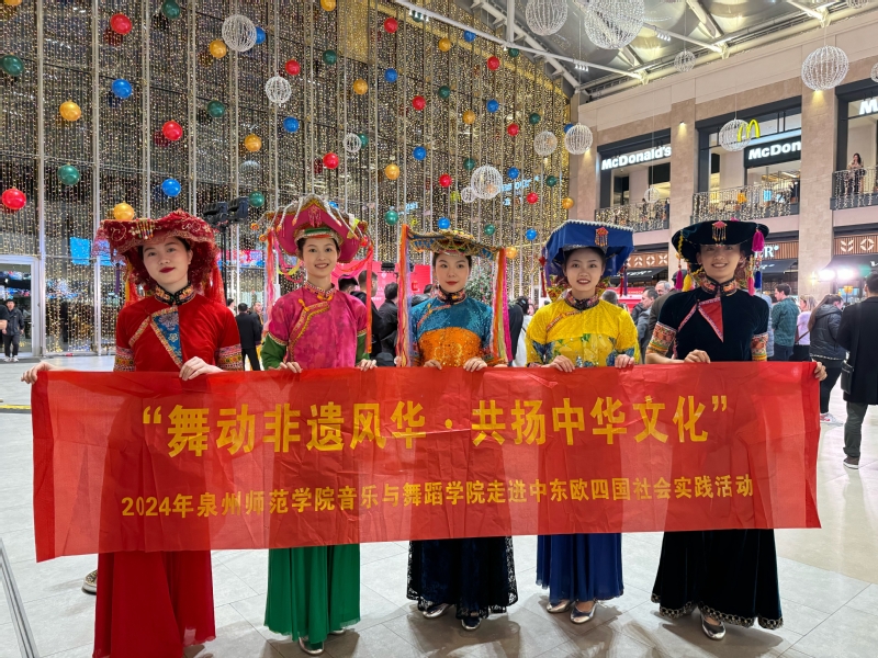 1月27日-2月9日,音乐与舞蹈学院实践队赴中东欧四国参加“世遗泉州·多彩非遗”2024年欢度春节活动,此次活动共走访匈牙利、罗马尼亚、保加利亚、塞尔维亚四个国家,共计演出11场。本次推介活动突出“活态”展示交流,形式多样,既有静态的非遗精品展,也有动态的演出展。队员们共参加开场舞蹈《刺桐花开》、服饰舞蹈《美丽惠安女》、歌伴舞《节日欢歌》、歌伴舞《望春风》以及茶艺展示和香道表演6项。