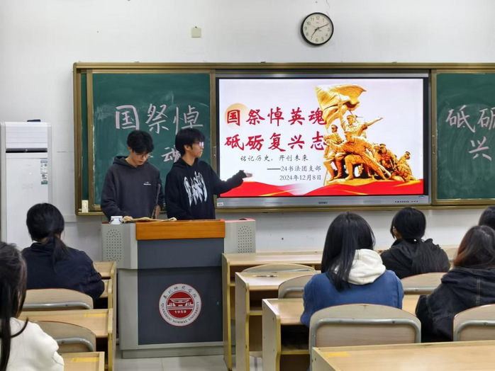 经过为期一周的精心筹备,各个班级围绕主题进行解读。其中,24广告通过播放精选爱国视频,激发同学们的爱国情怀与民族自豪感;24书法则深情讲述了赵一曼等革命先烈在抗日战争中的英勇事迹;24广电闽台采用了知识竞答的形式,让同学们深入了解国家公祭日的相关知识。