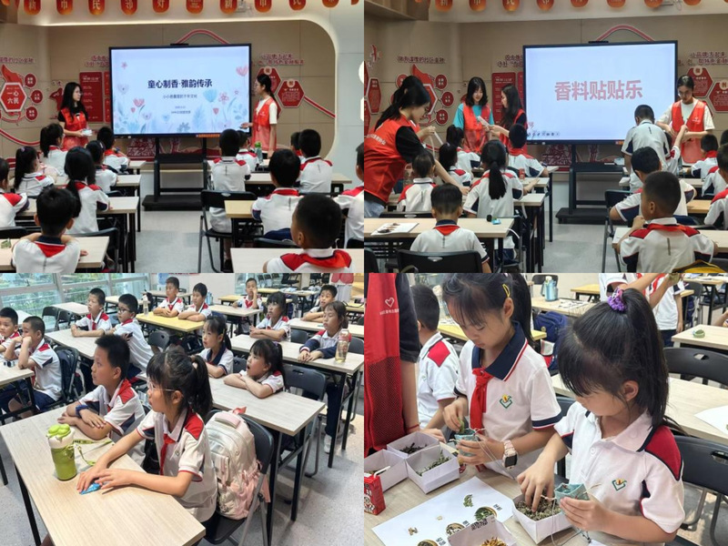 活动中,志愿者结合古籍知识与现代趣味,通过图文PPT与艾草、薄荷、陈皮等中草药实物,向孩子们讲解香文化千年历史及香料药用价值。互动环节中,“香料盲盒辨辨乐”点燃热情,孩子们闭眼嗅闻石菖蒲的辛香、苍术的苦香,争相为薄荷、陈皮等贴上名称标签;香囊DIY区,志愿者协助孩子们协作填充香囊。