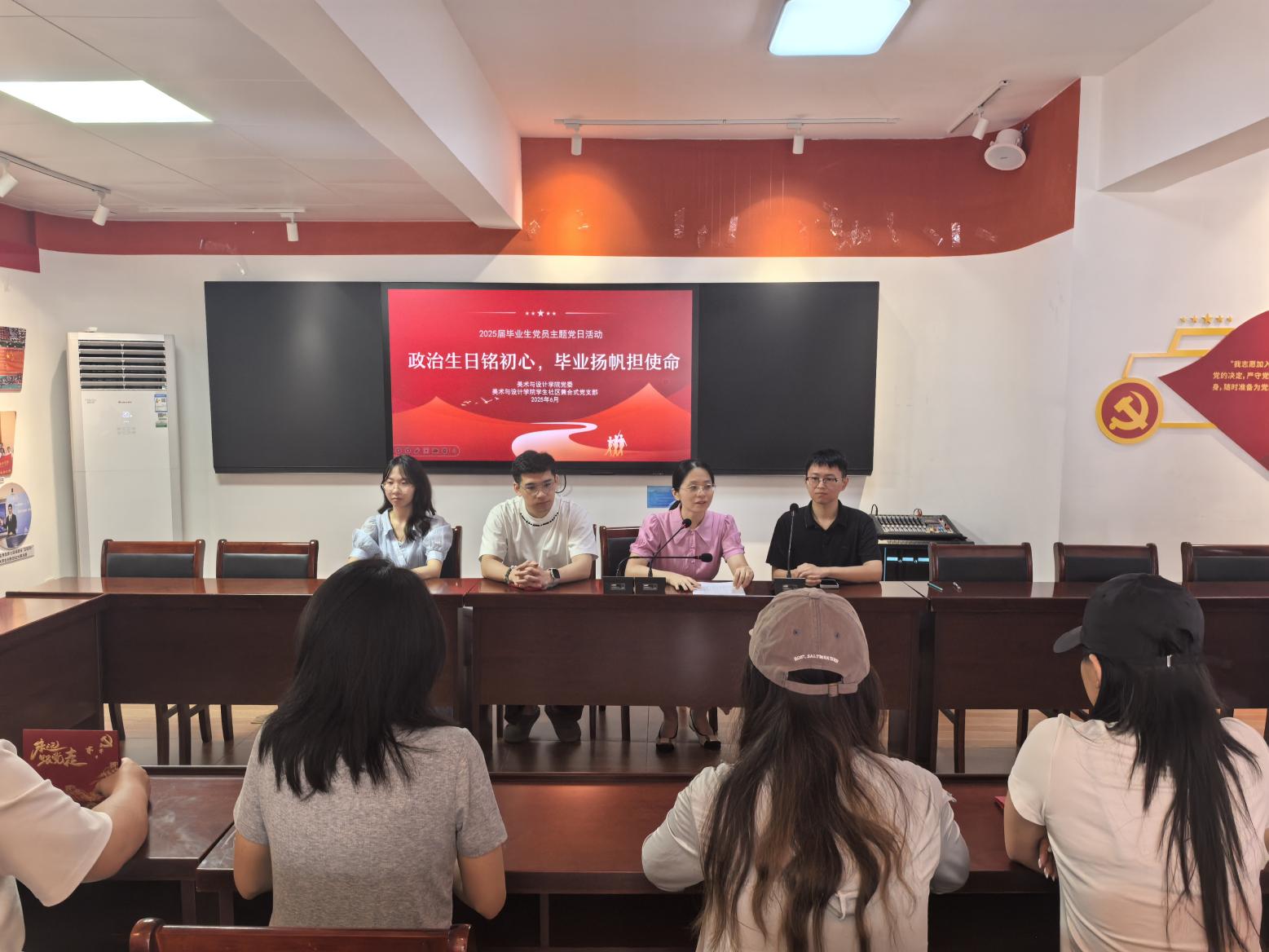 6月19日上午,美术与设计学院党委、美术与设计学院学生社区兼合式党支部在C区“一站式”学生社区联合开展“政治生日铭初心,毕业扬帆担使命”主题党日活动。美术与设计学院党委副书记、院学生社区兼合式党支部书记白雅芬,兼合式党支部委员骆泊屹、严恺、李颖及部分毕业生党员代表参加本次活动。