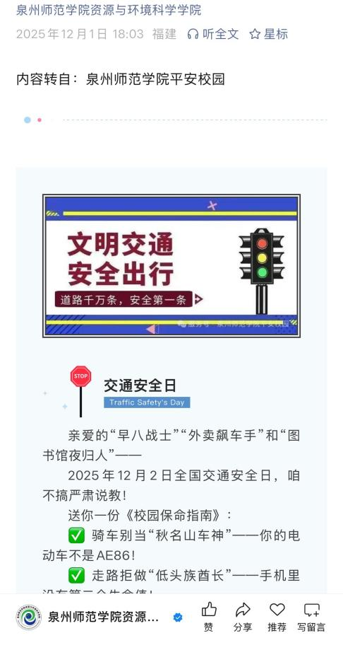 二、广拓线上宣传,筑牢安全意识。我院利用官方公众号“英国威廉希尔公司官网资源与环境科学学院”发布了“文明交通安全出行”安全专题内容,图文并茂解析骑车、走路、坐车的危险行为与正确操作,营造了良好的交通安全教育氛围,增长全院师生的交通安全知识,提高其交通安全意识和自我防护能力。