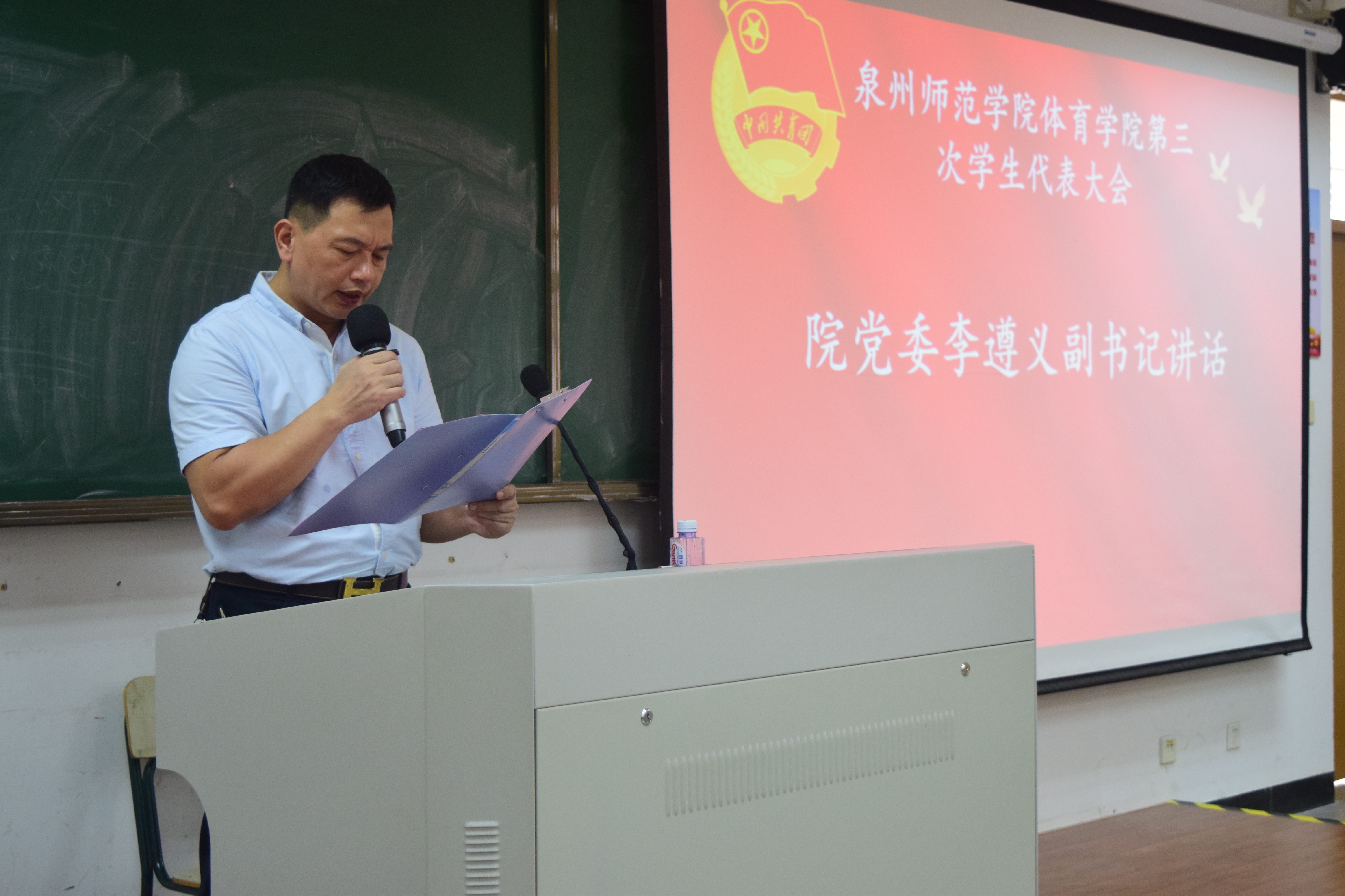 2021年6月27日下午,体育学院在荣茂402教室隆重召开第三次学生代表大会。院党委副书记李遵义、学工办主任、团委书记陈美婧、辅导员林增辉、校学生会代表刘隶劼同学以及各年级各专业推选出的正式代表30名出席了大会。