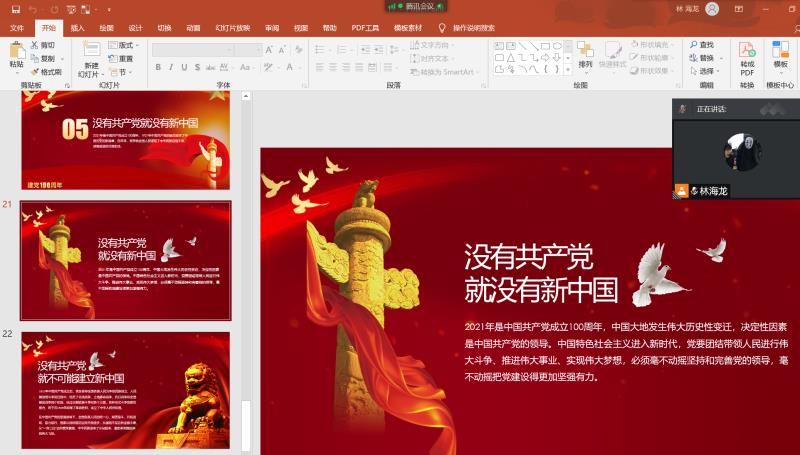 在一片热烈的掌声中,本次“我是党史领学人|学习习近平总书记在庆祝中国共产党建党100周年大会上的重要讲话”主题团日活动正式开始。团支书以《建党伟业》的一段视频让同学们再次忆起那段峥嵘岁月,加深了同学们对中国共产党认识。随后大家一同观看《习近平总书记在庆祝中国共产党建党100周年大会上的重要讲话》,同学们感触良多:立足中国共产党百年华诞的重大时刻和“两个一百年”历史交汇的关键节点,我们回望光辉历史、擘画光明未来。习近平总书记的讲话是新时代中国共产党人不忘初心、牢记使命的政治宣言,是我们党团结带领人民以史为鉴、开创未来的行动指南。我们要牢记初心使命,坚定理想信念,践行党的宗旨,永远保持同人民群众的血肉联系。接着,团支书开展党史知识竞答赛,同学们踊跃参与、积极互动,争先表达自己对中国共产党及其历史的理解。同学们深刻地认识到作为当代大学生肩负的历史责任,明白坚定理想信念、立志成才的重要性。