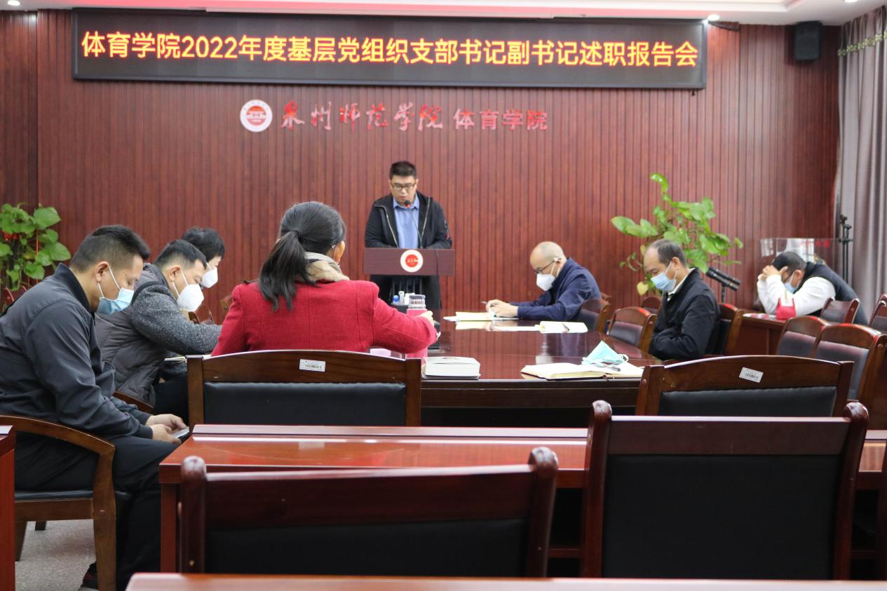 会上,各基层支部书记的述职内容主要围绕过去一年的工作开展情况,自我剖析党建工作中存在的问题,提出下一步工作思路和实施的具体措施。与会的学院领导根据会议述职和平时了解掌握的情况,对各支部开展的工作一一进行点评,并提出要求。学院各领导对4名基层党组织党支部书记党建工作述职充分肯定一年以来的工作成绩,尤其是各支部在年初抗击新冠肺炎疫情所做出的努力和贡献,同时也指出了学院基层党建工作中存在的不足和今后需要努力的方向,结合学校和学院2022年党建工作基本情况,就进一步抓好基层党建工作提出明确要求:一是要提高思想政治站位,要以党的二十大召开为契机,进一步深入学习贯彻习近平新时代中国特色社会主义思想,把加强党的领导放在首位,牢固树立“抓党建是最大主业”意识,把党建工作落到实处,把工作做实做细;二是要加强党建与专业建设相结合,充分利用“三会一课”制度,围绕教学、科研、学生管理、对外交流和社会合作开展党建工作,更好地将党建与体育各专业有机融合,不断拓宽体育学院院基层党建工作新渠道,结合体育学院的专业特点,注重挖掘亮点,凝练党建品牌,彰显支部特色;三是要进一步提高各支部工作的积极性和主动性,化被动为主动,能担当敢作为,各党支部书记要发挥好领头羊的作用,加强支部立项工作,让基层党组织充满活力,充分发挥党员先锋模范作用。