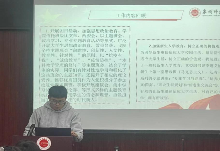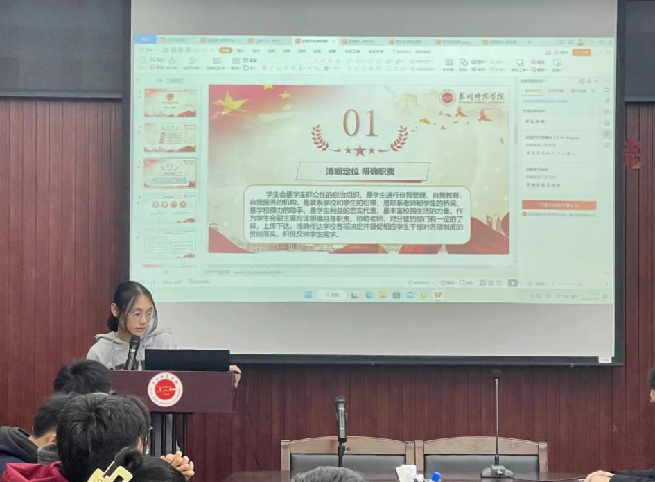 会议开始,学生会主席苗润泽对学生会上半学年各项工作进行梳理和总结。随后,各部门主要负责人从政治态度、道德品行、学习情况、工作成效、纪律作风等方面总结各自工作中成绩、经验和不足。院学生会全体成员以及学院辅导员根据述职情况对主席团和各部门负责人进行无记名式评议打分。