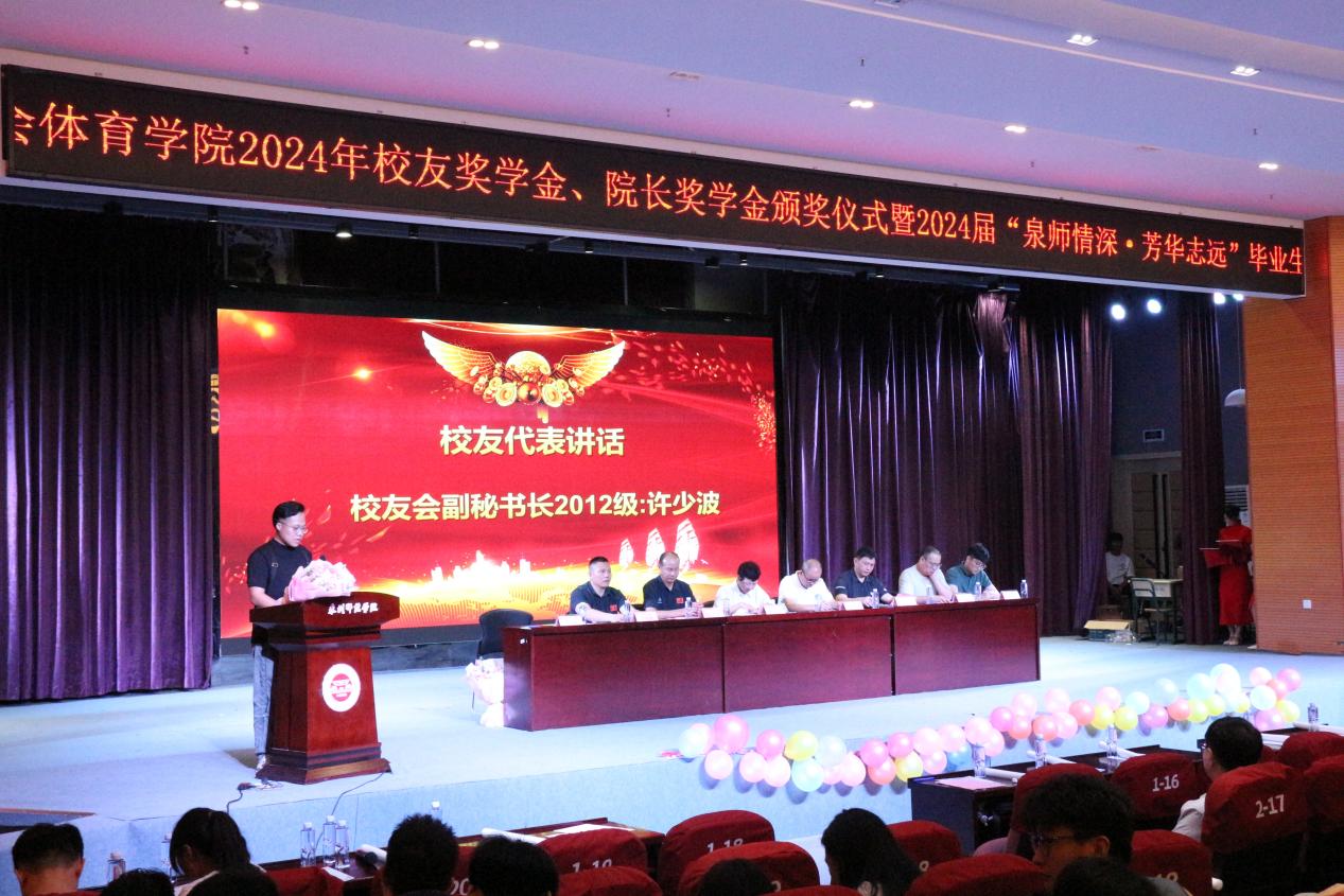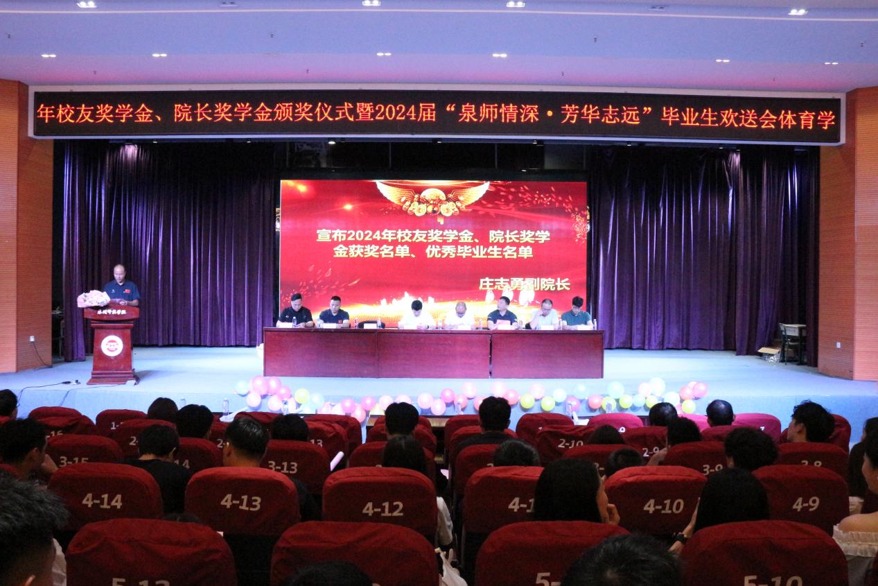 6月16日晚,体育学院在特教大楼第一学术报告厅隆重举行2024年校友奖学金、院长奖学金颁奖仪式暨2024届“泉师情深,芳华志远”毕业生欢送会。颁奖仪式邀请了校友会副会长兼秘书长冯荣胜(87级)、薛文煌(06级)及副秘书长许少波(12级)等三位校友代表出席,院长许月云、党委正处级干部董清海、党委副书记李遵义、副院长庄志勇、副院长王伯余、全体辅导员及师生出席了此次活动。颁奖仪式由党委副书记李遵义主持。