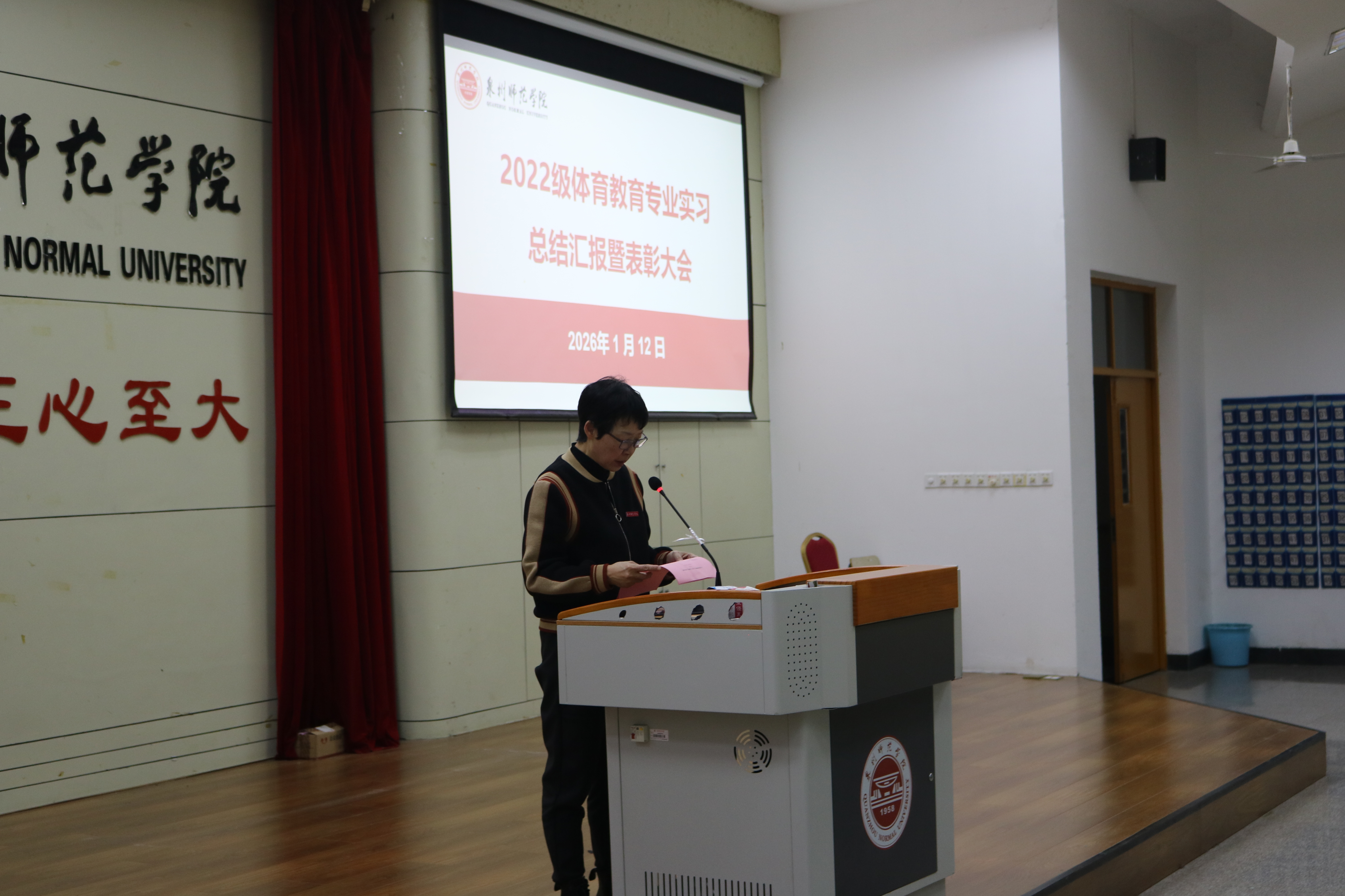 为进一步推进体育学院教育教学改革发展,总结2022级体育教育专业教育实习工作成效,表彰实习过程中涌现的优秀个人与先进典型,2026年1月12日,体育学院召开2022级教育实习总结表彰大会。院长许月云,党委书记郑少君,教学科研办主任郑婷婷,学工办副主任林增辉,各实习带队老师,全体辅导员,2022级体育教育专业学生及2023级体育教育专业学生参会,会议由体育教育专业副主任徐敏主持。