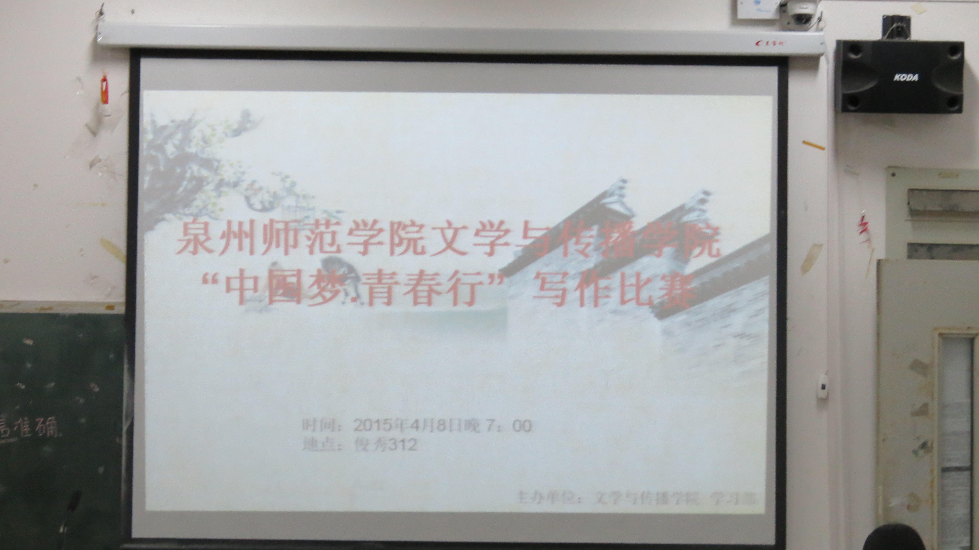 本报讯(记者 傅思慧 张耿榕)4月8日晚7点,由我院学习部主办的“中国梦﹒青春行”主题写作比赛在俊秀312举行。我院各专业同学踊跃报名,约35人到达现场参加比赛。