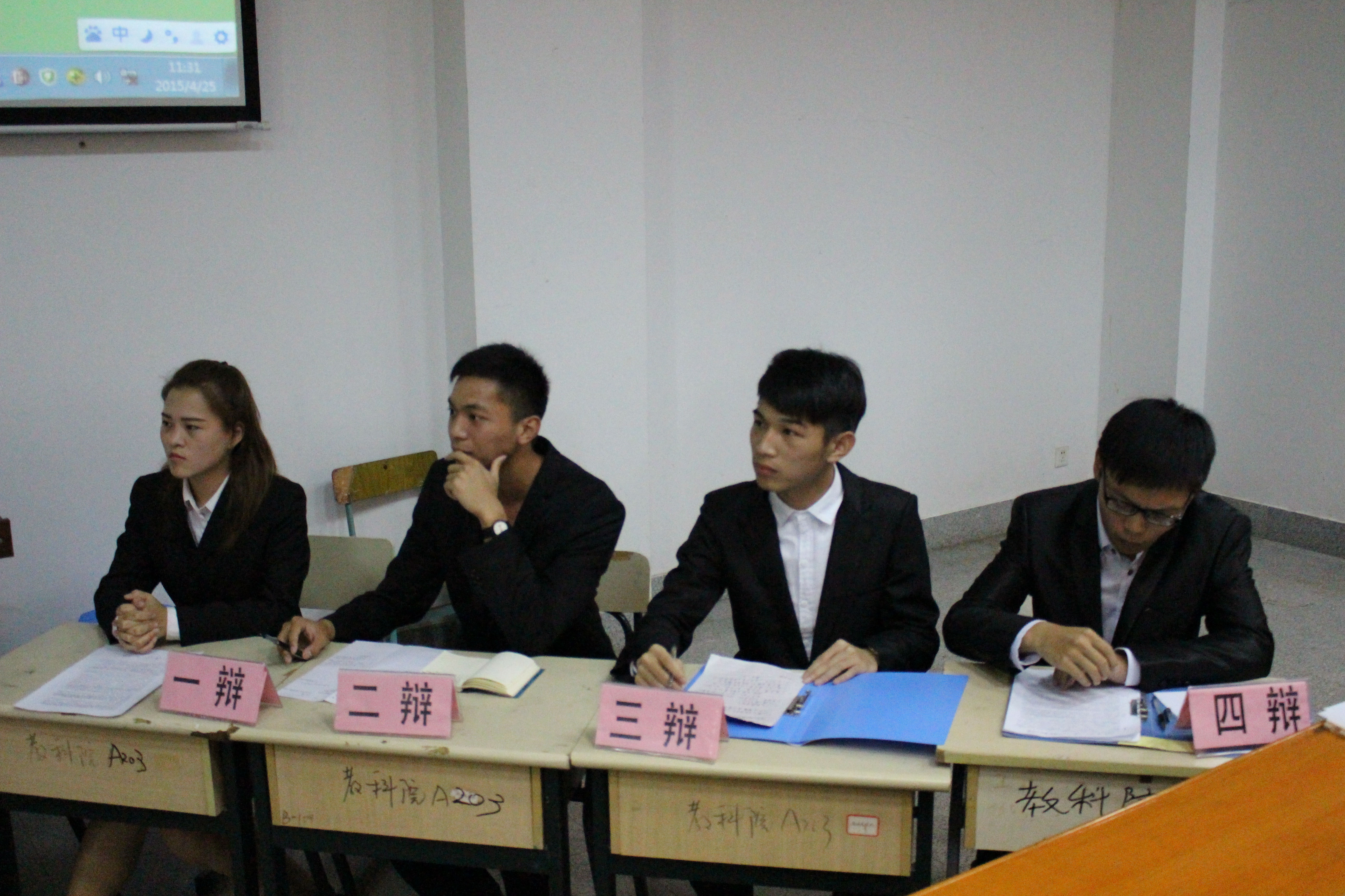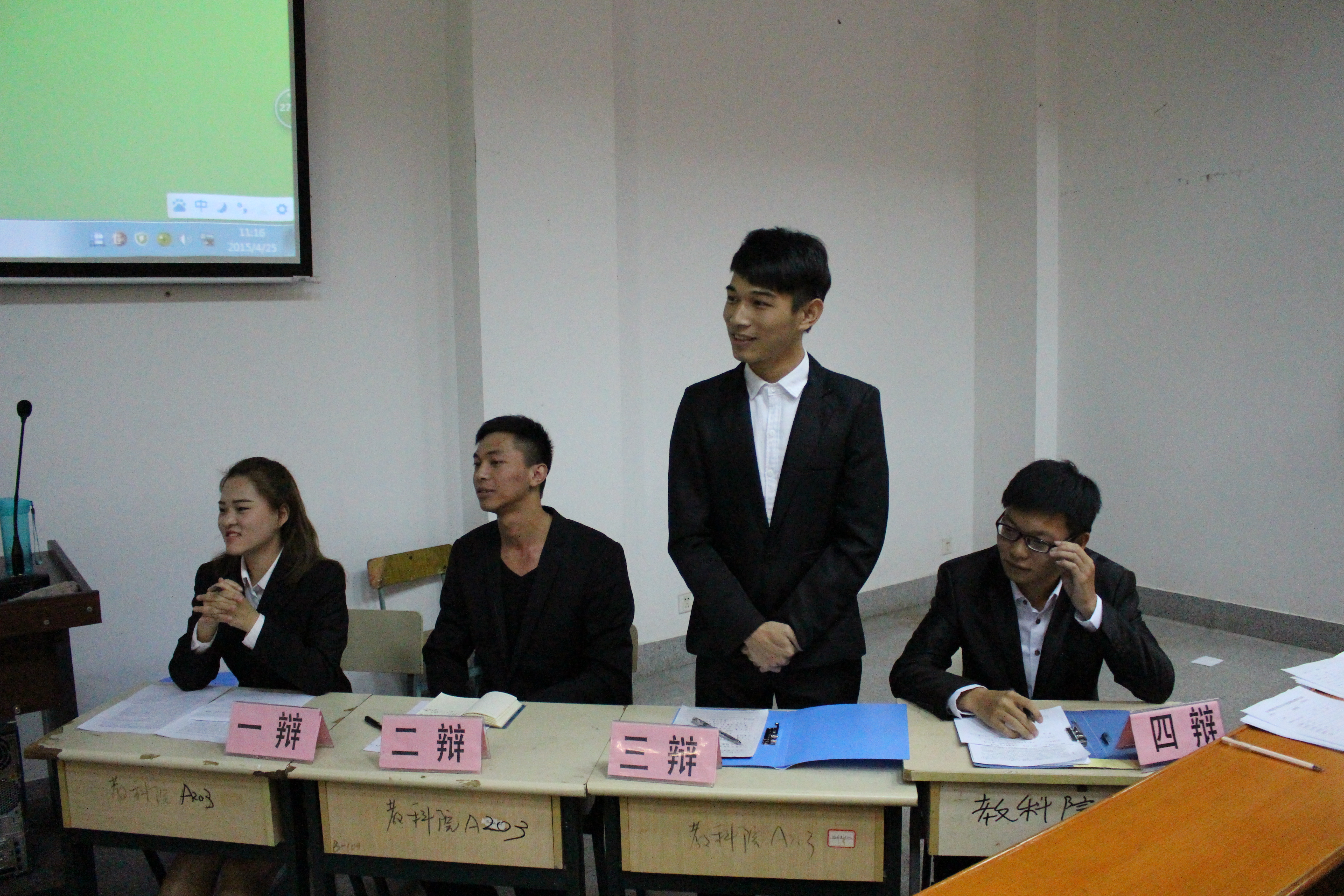 本报讯(记者李志琴陈明媚)4月25日上午,我校第一届校辩论赛复赛在文A214隆重举行。据悉,本次比赛由文传学院学生会副主席王睿莹、数计学院学生会副主席姚玲斌、校辩论队队长李山、校辩论队副队长李晓迪、校广播播音部部长李丽娅以及来自各二级学院的20位大众评审担任评委。最终经过激烈论战,我院辩手获胜,成功挺进半决赛。