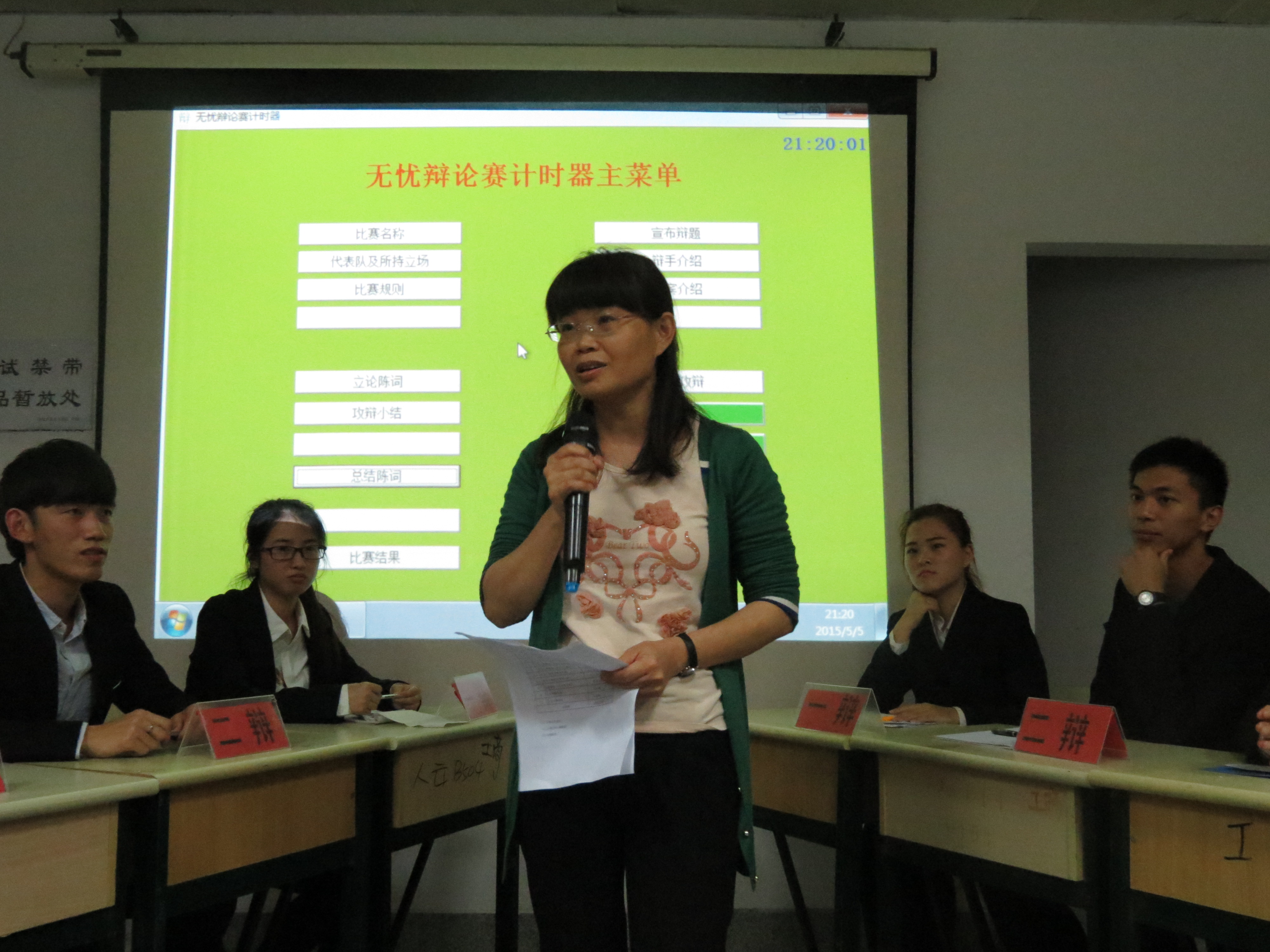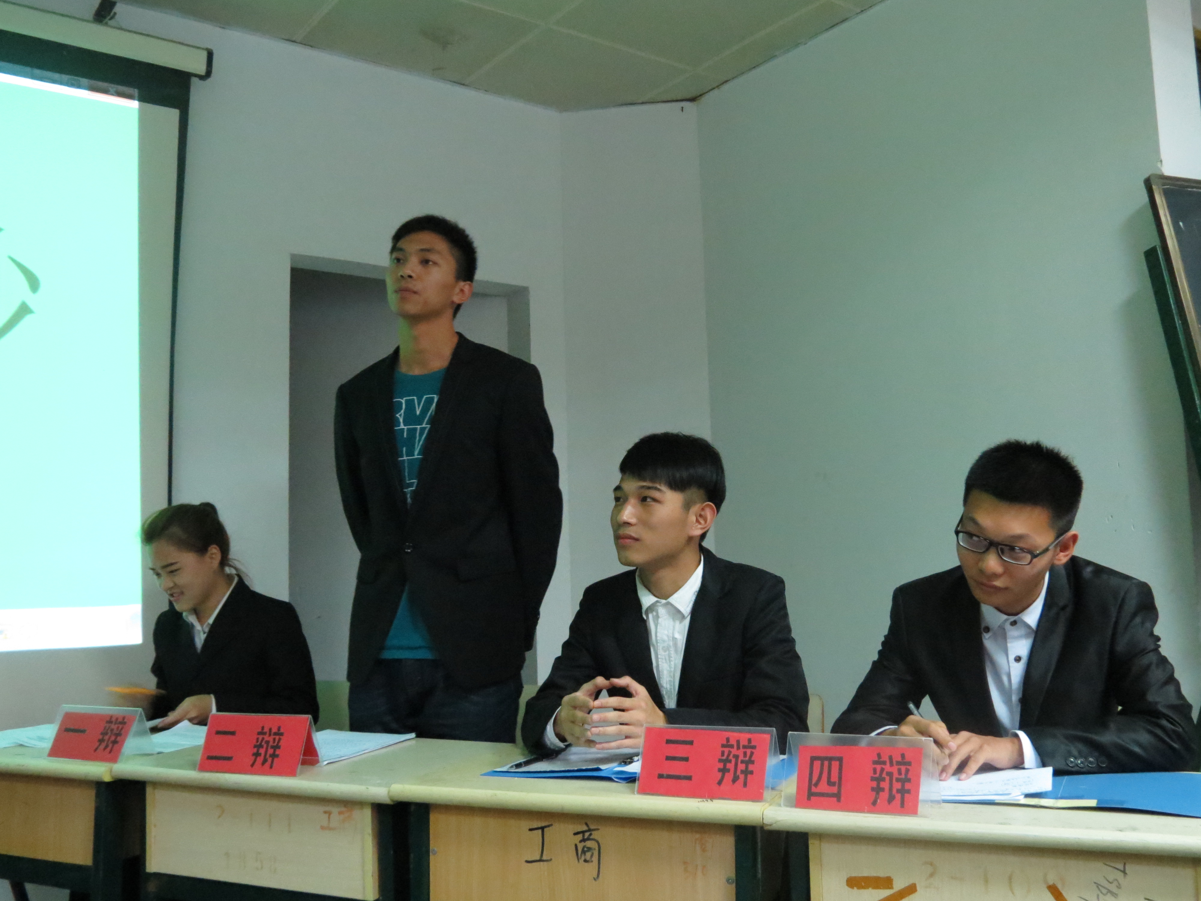 我院代表队和资环代表队针对“大学生就业应该干一行爱一行还是爱一行干一行”这一辩题展开生动的辩论。我院代表队持“大学生应该爱一行干一行”的观点,派出一辩肖倩、二辩徐金晓、三辩陈迪和四辩王宇作为反方代表。首先,我院一辩在开篇立论中表明“大学生应该爱一行干一行”的观点,并从理论出发确立分论点,语言精练,逻辑性强。紧接着在攻辩环节中,我院二、三辩用犀利的言辞多次击破正方观点,二位丰富的实战经验也为本场比赛增彩不少。比赛进入到自由辩论阶段,双方引经据典、旁征博引、你来我往,赢得观众阵阵掌声;最后双方总结陈词,我院四辩王宇表现可圈可点,反驳对方论述时思路清晰,同时再次强化反方观点,而他厚实的文化功底和出色的口才也令场下观众为之折服。赛后,邱晓明老师对本次比赛进行点评,她首先肯定了辩论双方对辩题认知的正确性,并对我院四辩在总结陈词环节的表现予以高度评价。她提出在辩论赛中需要注意规则和技巧,要善于抓住对方言辞漏洞,进行有效攻击。