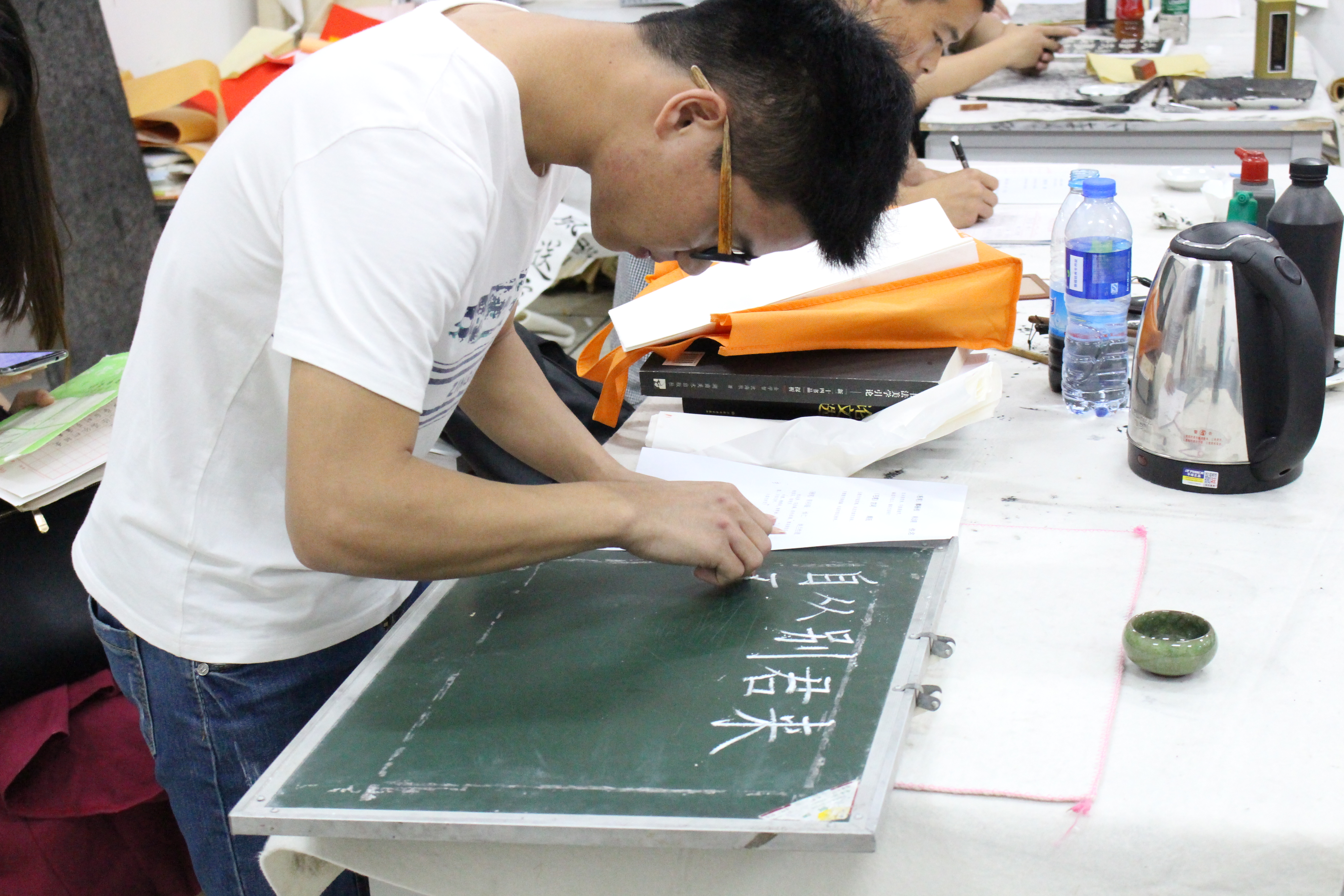 比赛采用积分制,由粉笔、毛笔和硬笔三部分组成,每项计入总分。比赛主要以书写经典诗文为主,其中粉笔比赛的题目为《攀杨枝》,硬笔比赛的题目为《青衫湿·悼亡》,毛笔比赛的题目则为《宫词》。每位选手要在2个小时之内独自完成三幅作品。我院12广电黄志根、13中一王鑫辉以及13中一陈书平参赛。在紧张的氛围中,我院选手沉着应对,游刃有余。三人作品风格各不相同,以良好的心理素质以及认真严谨的态度展现自己的实力。据了解,比赛结果将在近期公布。
