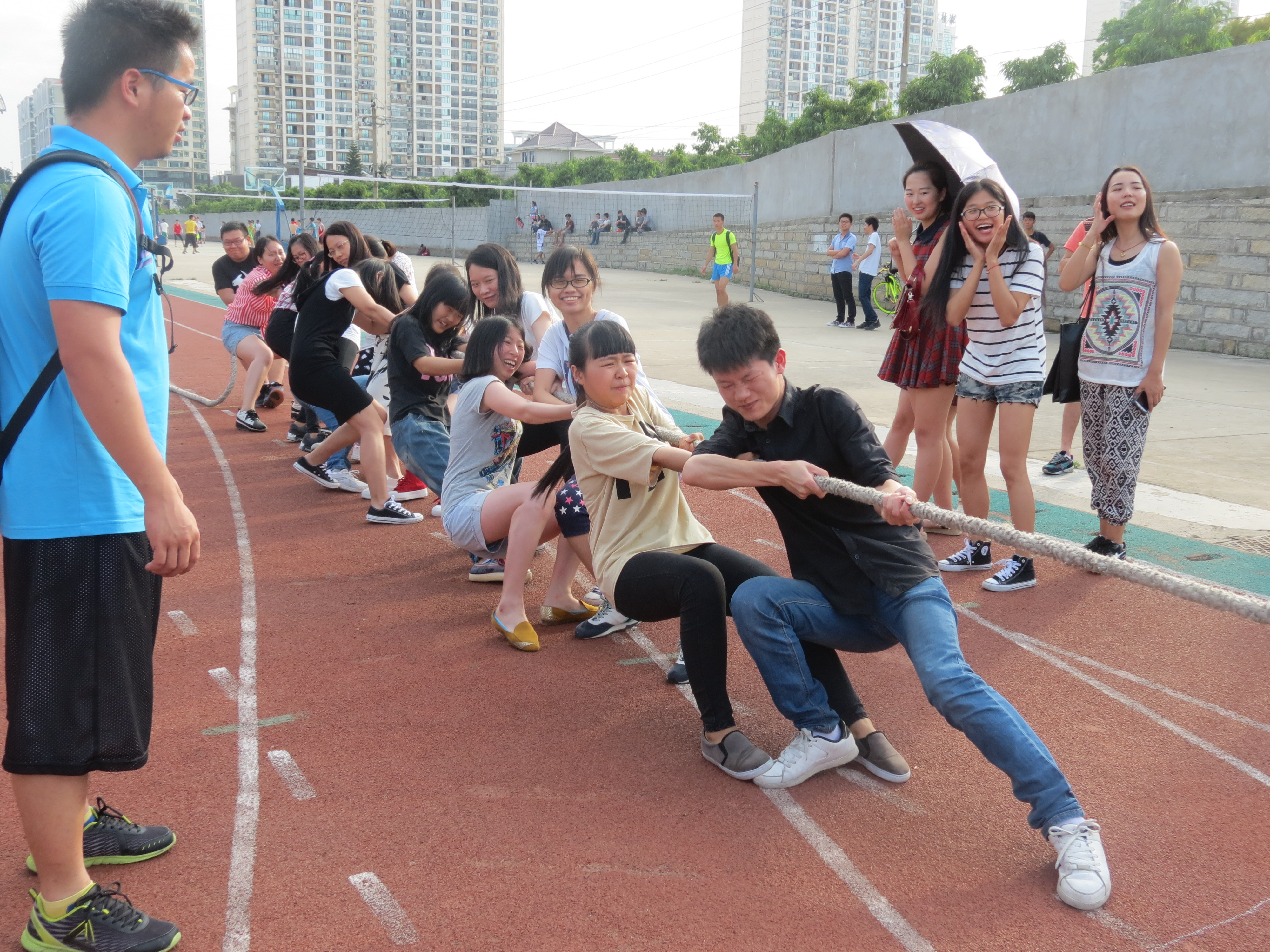 本报讯(记者杨浩张耿榕谈笑)5月14日下午,我院第五届阳光体育节之拔河比赛在操场如期举行。本次比赛由我院团委会和体育部联合主办,根据13、14级学生组成的16个团体,分为甲、乙两组进行角逐。其中,甲组由中文、文员、对外组成;乙组由广电、书法、广告和广告(闽台)组成。经过轮番竞赛,最终,14文一夺得甲组桂冠,13对外、13中二分别位于甲组第二第三名;乙组则由14广电、13广电荣获一、二名。