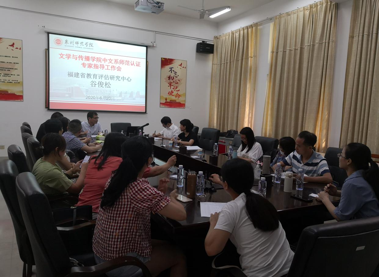 6月20日下午,文学与传播学院中文系召开师范认证专家指导工作会。福建省教育评估研究中心谷俊松老师受邀出席会议,文传学院杨秋生副院长、学院各职能部门、中文系全体教师参加会议,中文系翟勇老师主持会议。