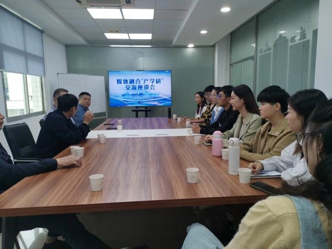一行人首先来到泉视新媒体发展有限公司,进行以媒体融合“产学研”为主题的座谈会。公司总经理潘海阳、总经理助理黄佶就公司的组织架构、业务矩阵、运营模式等进行了全面的介绍。泉视新媒体发展有限公司是泉州广播电视台全资子公司,主要运营“无线泉州”APP、“新闻广角”微信公众号等新媒体业务。