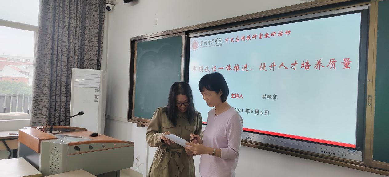 为了落细落实“申硕认证一体推进,培养拔尖创新人才”总体战略构想,充分发挥福建省高校课程思政优秀教学案例“凝练闽南意象,讲好海丝故事”示范引领作用,文传学院中文应用教研室按照上级统一部署,于6月6日下午在俊秀文学院东楼305教室,专题研讨“何以为师 行见山海”实践教学体系建设。本次活动由教研室主任张婉霜博士主持,全体归口教师、在学研究生(含联合培养硕士生)、高年级本科生代表参加,校级督导员颜莉莉副教授、院级督导员通拉嘎副教授亦莅临现场指导。