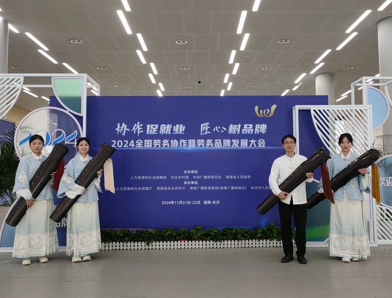 11月21日,文学与传播学院吾有古琴社三位学子受邀参加由人力资源和社会保障部、农业农村部、中央广播电视总台、湖南省人民政府共同主办的“2024全国劳务协作暨劳务品牌发展大会”,在活动的开幕式中进行古琴主题演出。
