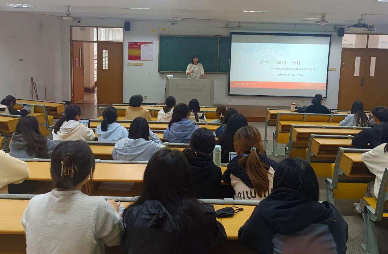 为了提早谋划来年学生就业工作,落实省级一流本科专业建设指标要求,助力教育硕士专业学位研究生授权点培育创建,文传学院中文系按照上级整体部署,专门邀请晋江市养正中学许萍萍老师(2004届优秀系友),于11月21日(周四)下午在荣茂综合楼301教室,为学科教学团队骨干教师、在学研究生(含联合培养)、汉语言文学专业高年级本科生,做了一场题为《好学·深思·力行——核心素养背景下的语文教学思考》的专题报告,并在宋妍博士的主持下参与相关的教学研讨活动。